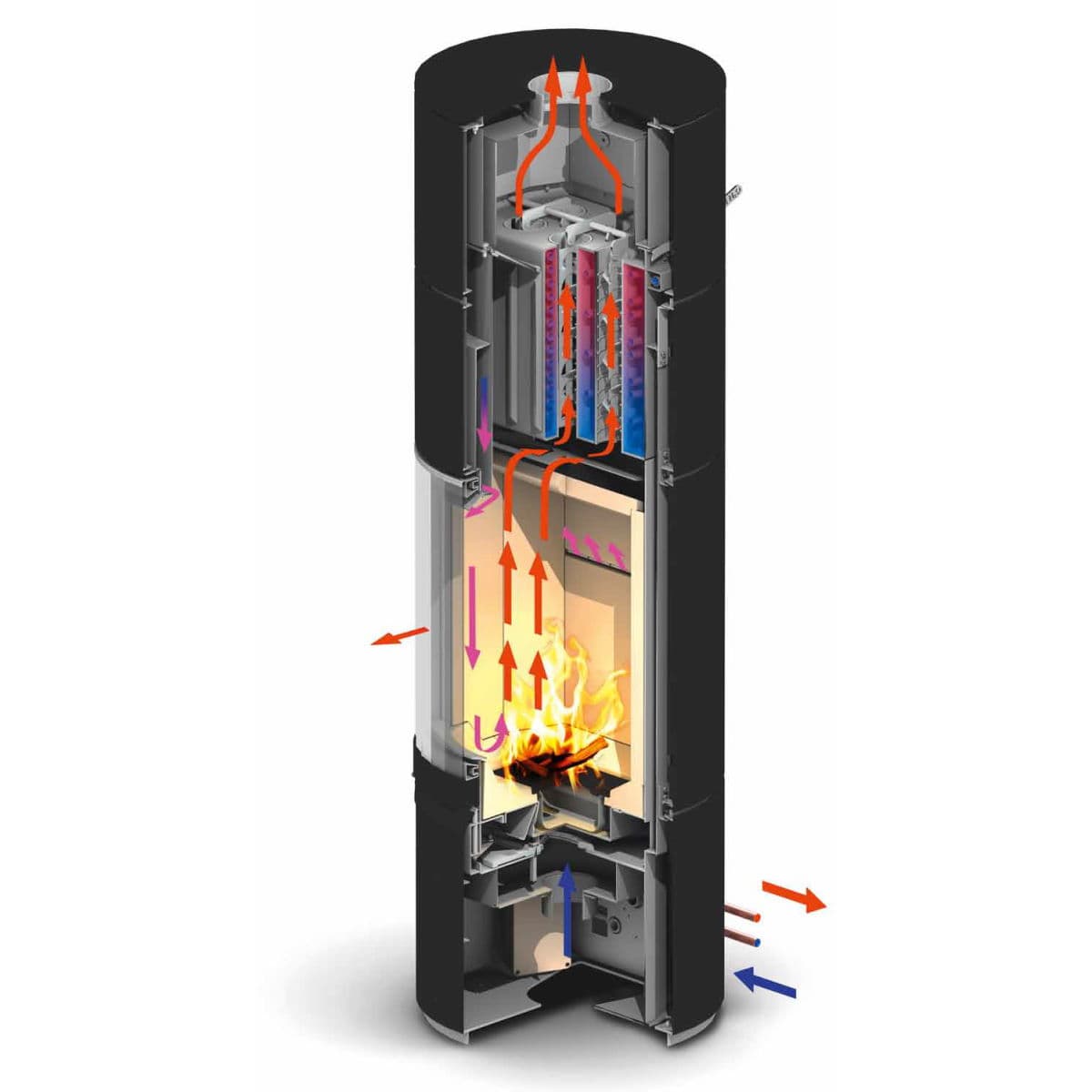 Spartherm Ambiente A4 H2O - это дровяная печь с водяным контуром. Высокая производительность теплообменника сочетается с высокой эффективностью сжигания дров. Печь оснащена дополнительным контуром для защиты теплообменника от перегрева. Цилиндрическая форма позволяет установить печь в любом помещении. Панорамная дверца выполнена в современном стиле с тонировкой по периметру стекла.