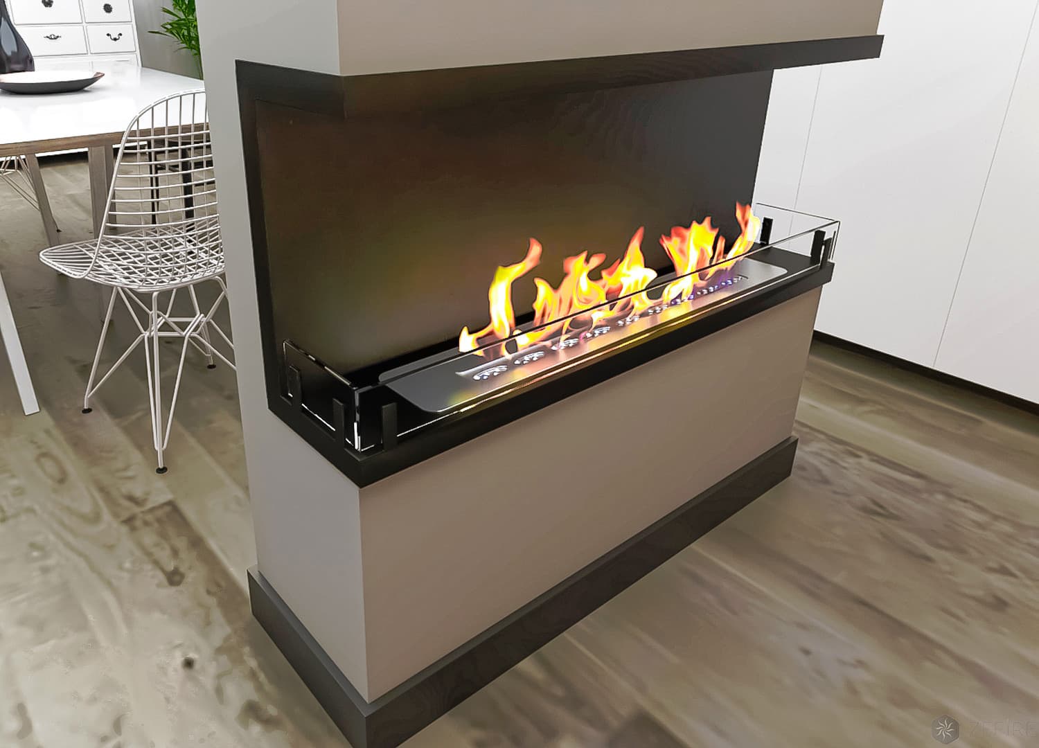 У торцевого очага есть одна задняя стенка, параллельная линии огня. Он открывает пламя на три стороны и имеет большой угол обзора. Для безопасности топку ограждает закаленное стекло – обязательный элемент конструкции.