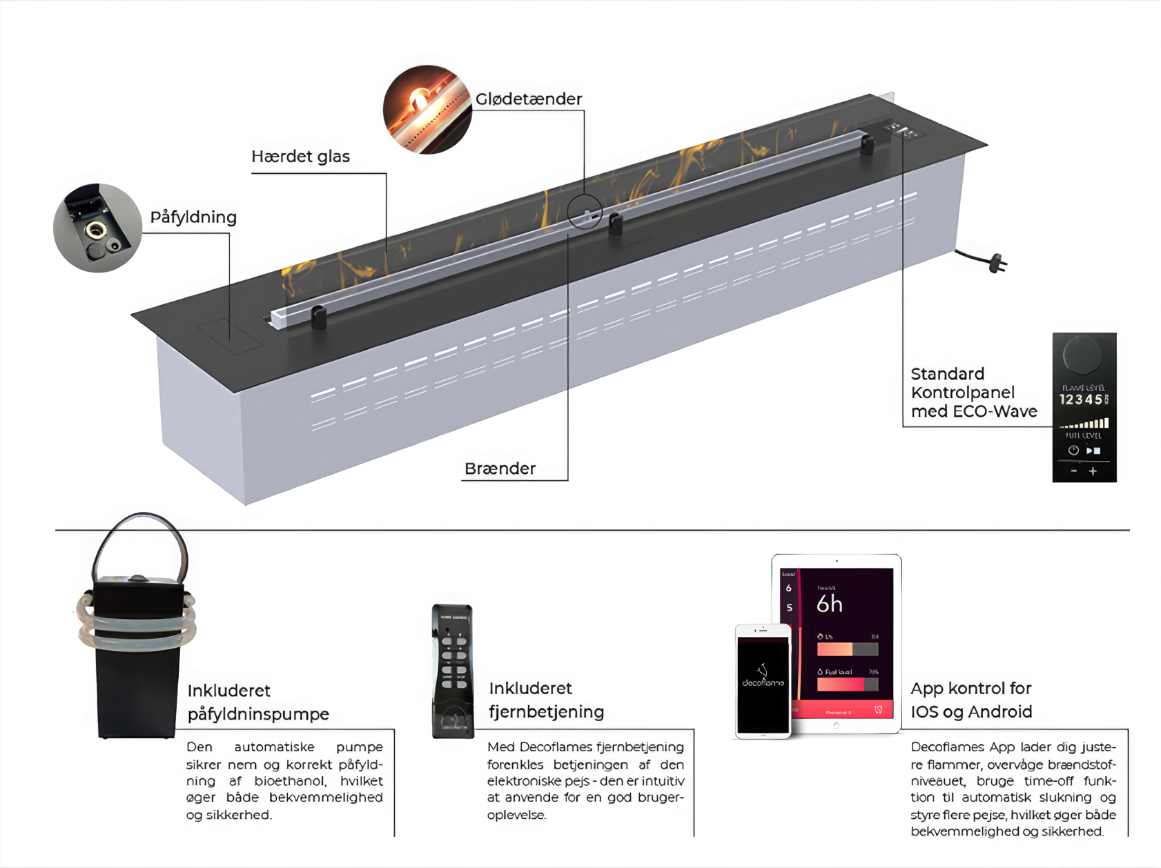 Разработанный опытными инженерами Decoflame, Denver F6 1720 представляет собой революционную инновацию в современных каминах. Благодаря запатентованной технологии BEV (сжигание паров этанола) он воплощает собой роскошные дополнительные решения для отопления, впечатляя расширенными функциями, включая 6 уровней пламени, функцию ECO WAVE, управление через приложение, подключение Bluetooth и передовые системы безопасности.