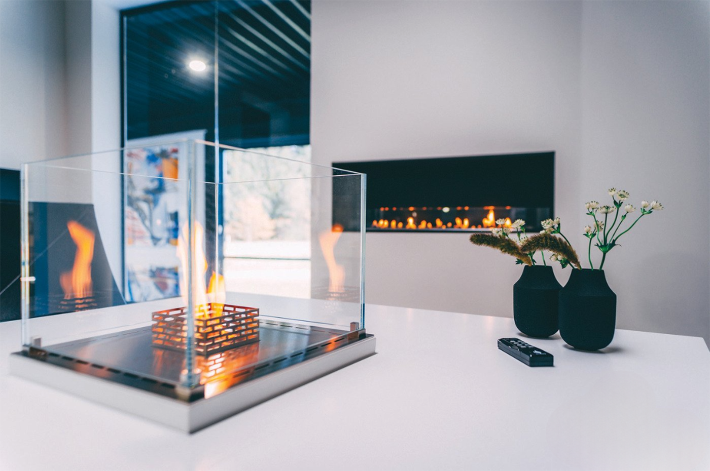 Биокамины модели Монтреаль доступны с ручной и электронной биогорелкой, а также с системой Hybrid Mist. Биокаминами можно управлять напрямую через дисплей на камине, с помощью прилагаемого пульта дистанционного управления, либо через приложение Decoflame.