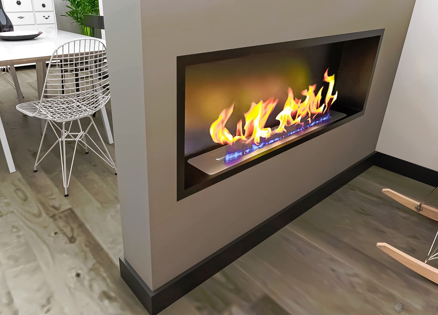 Биокамин работает на жидком экологичном топливе. Состав на спиртовой основе при сгорании не выделяет дыма, гари и копоти. Поэтому устройство не привязано к коммуникациям и его можно инсталлировать в любую ненесущую конструкцию. В том числе – в короб из гипсокартона или мебель из МДФ. Для теплоизоляции в последнем случае достаточно минеральной ваты и фольги.