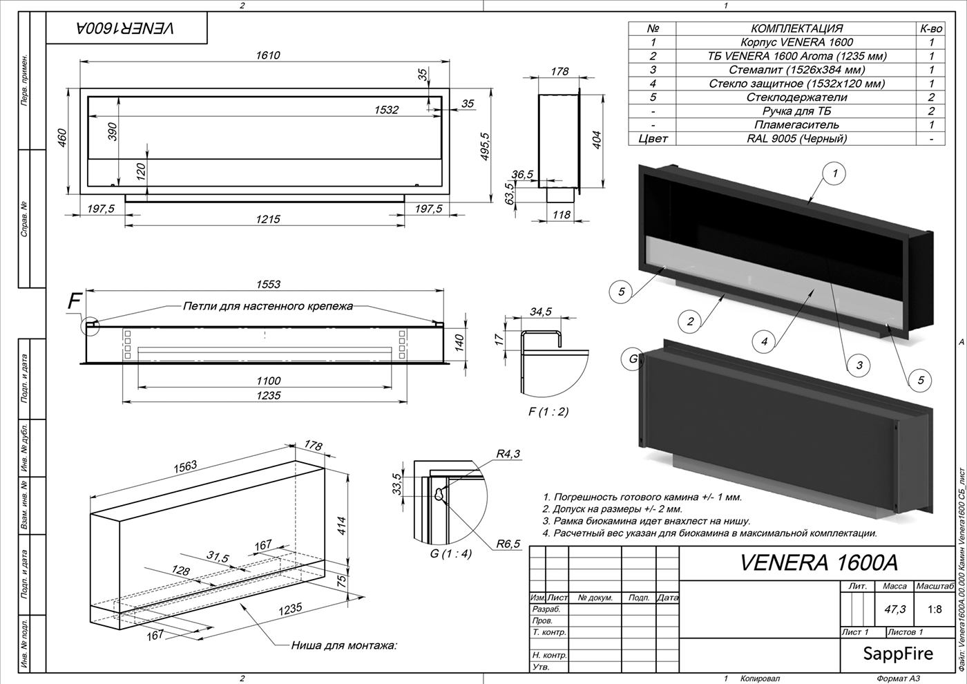 Биокамин Venera 1600 шлифованный (SappFire) производитель SappFire