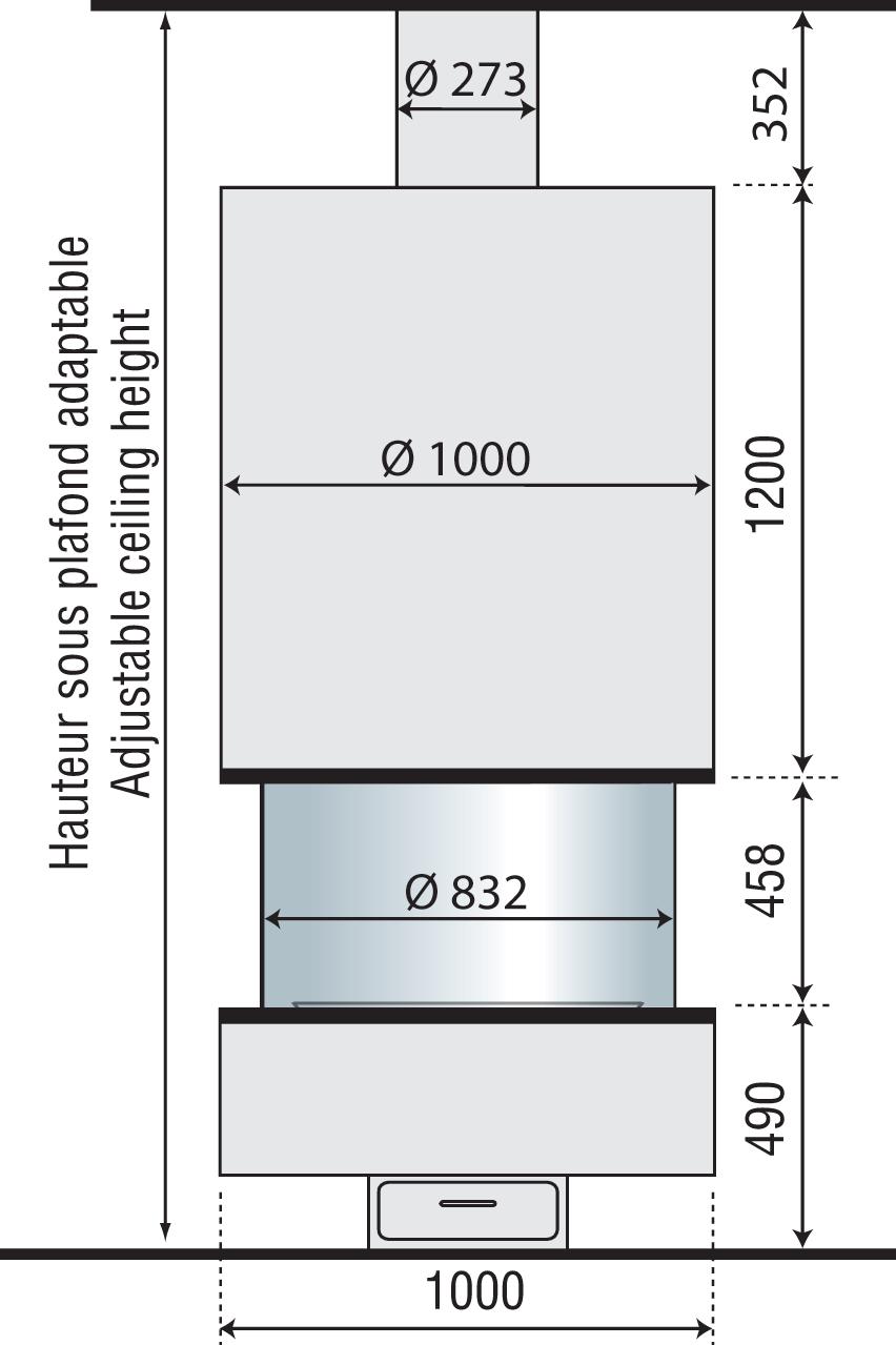 Изготовлен из легированной стали и огнеупорного керамического стекла. Топка у камина остекленная со всех сторон камина, благодаря чему панорамный обзор пламени доступен из любой точки помещения и с любого расстояния.