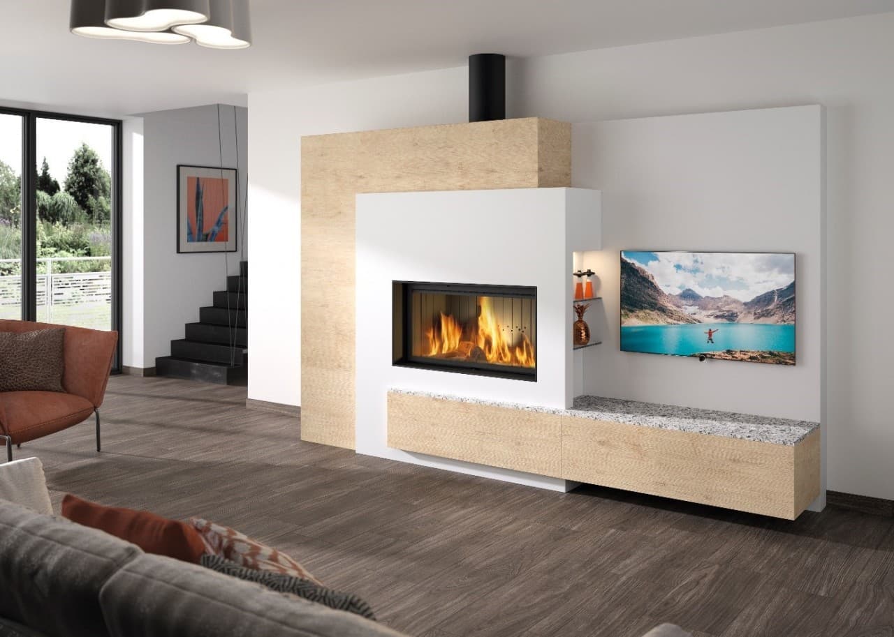 Облицовка Cheminée MANTOU - современное каминное оформления из камня и дуба. Для данной облицовки идеально подходит топка Cheminees Philippe Perform 1000.