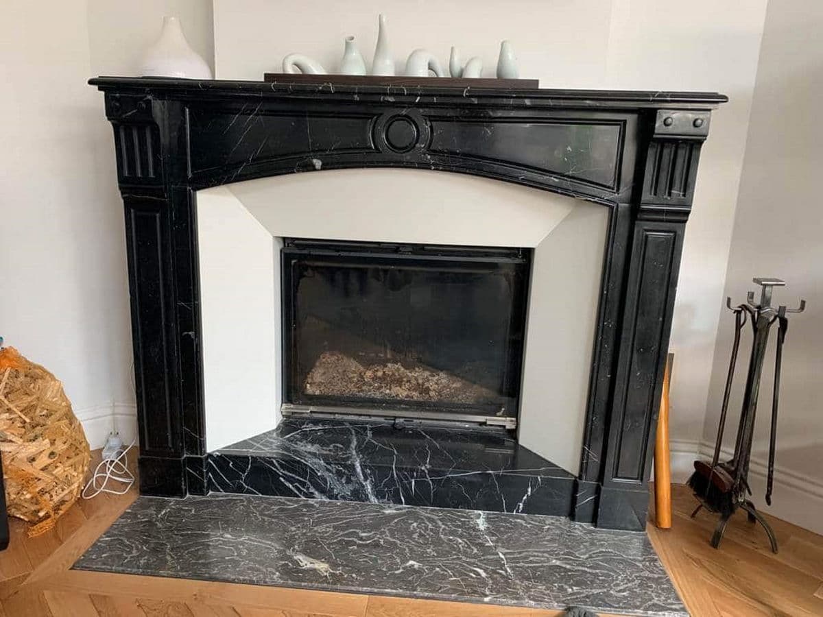 Мраморный камин с белой стальной рамой и камином 778 подъемная дверь