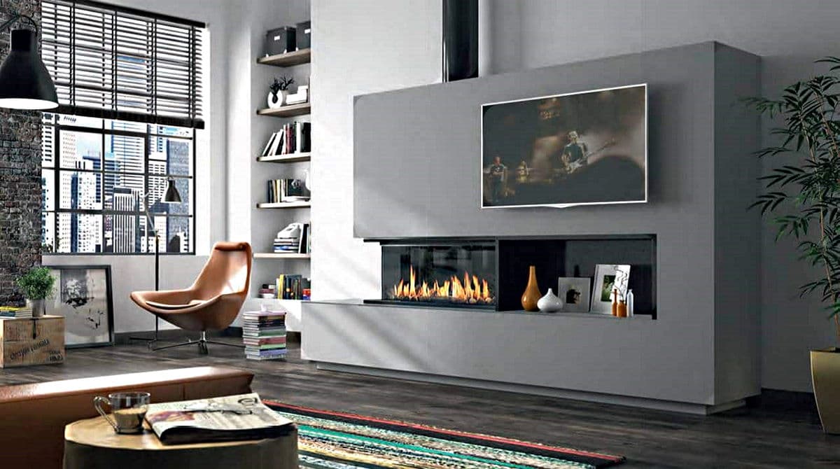 Облицовка Cheminée MONDONEY - это современное каминное оформление для топок Cheminees Philippe 747-2V и 777-2V. Стальная рама может быть окрашена в различные цвета, опционально доступны дополнительные встроенные стеллажи.