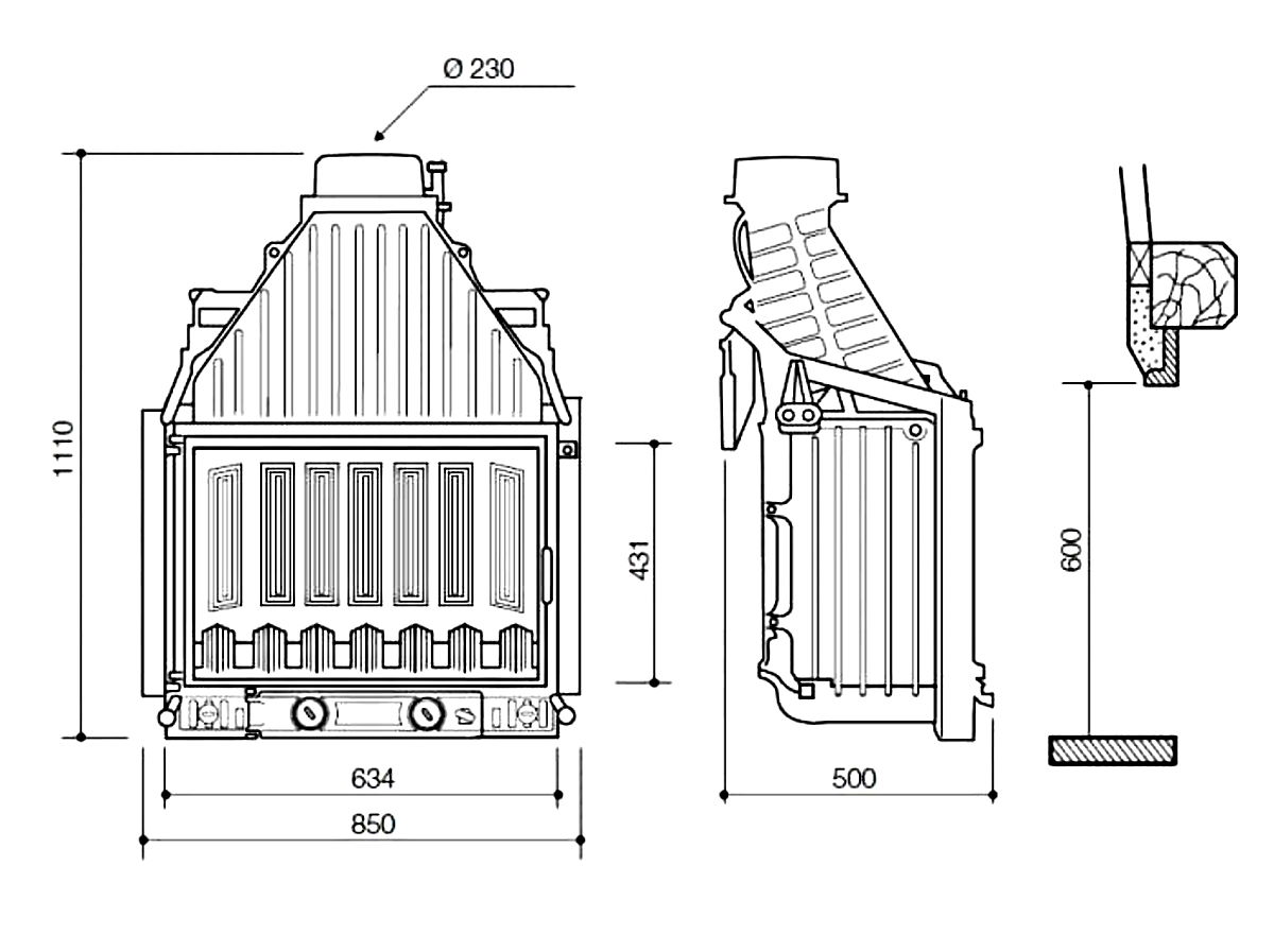 Каминная топка Cheminees Philippe 700 с корпусом из жаропрочного толстостенного чугуна, который способен десятилетиями успешно противостоять открытому огню, копоти и конденсату. Данная топка оборудована подъемной дверцей со смотровым окном из стеклокерамики. Представленная модель имеет трехканальную систему регулировки притока воздуха.