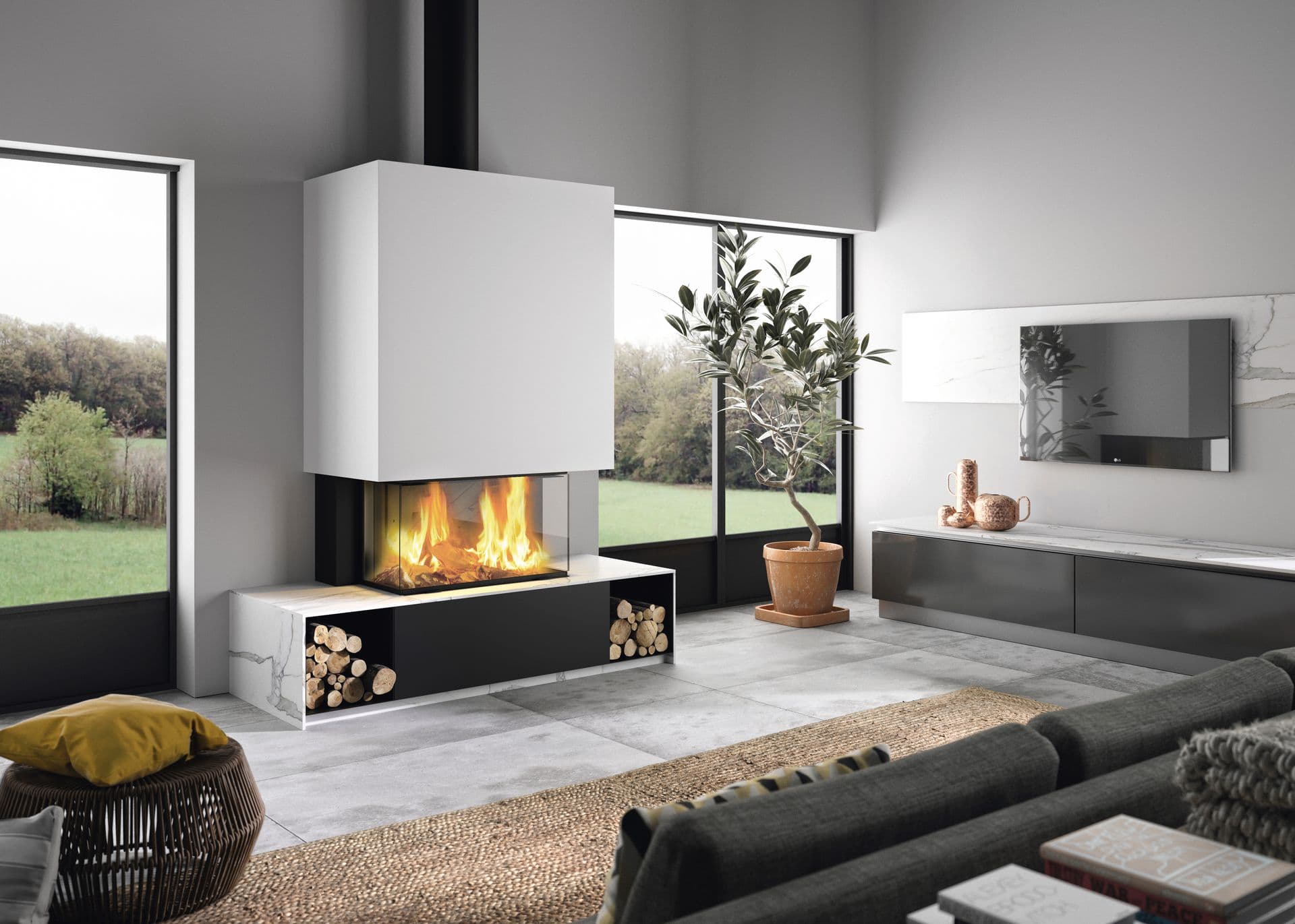 Облицовка Cheminée FAUVEL - современное каминное оформление из керамики. Основание со встроенными нишами и окрашенными в чёрный цвет колоннами. Для данной облицовки идеально подходит топка Cheminees Philippe 790-3V.