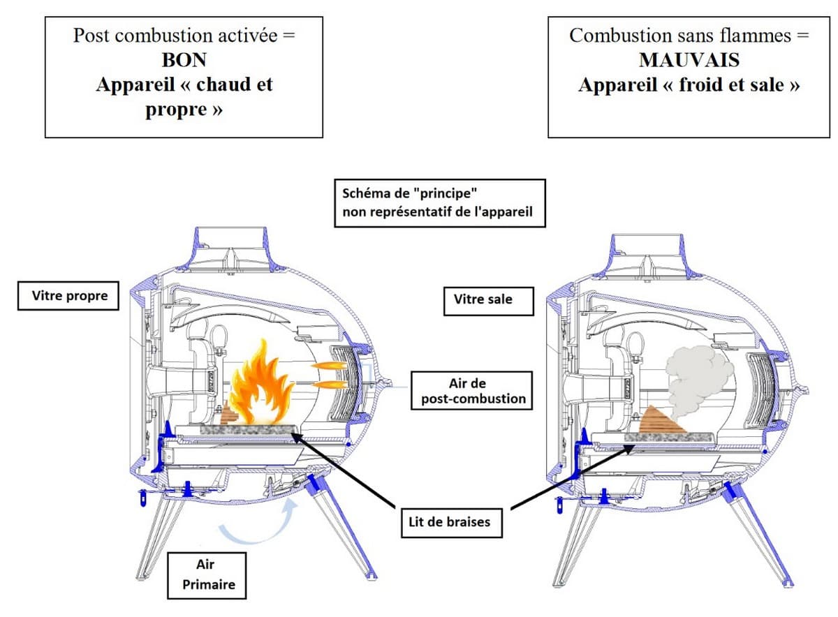 - Система чистого стекла замедляет загрязнение стекла. Воздухозаборник в верхней части стекла создает защитную вуаль. Предварительно нагретый воздух продвигается по стеклу. Он вызывает горение газов и летучих материалов, защищая стекло от дыма и отложений сажи.