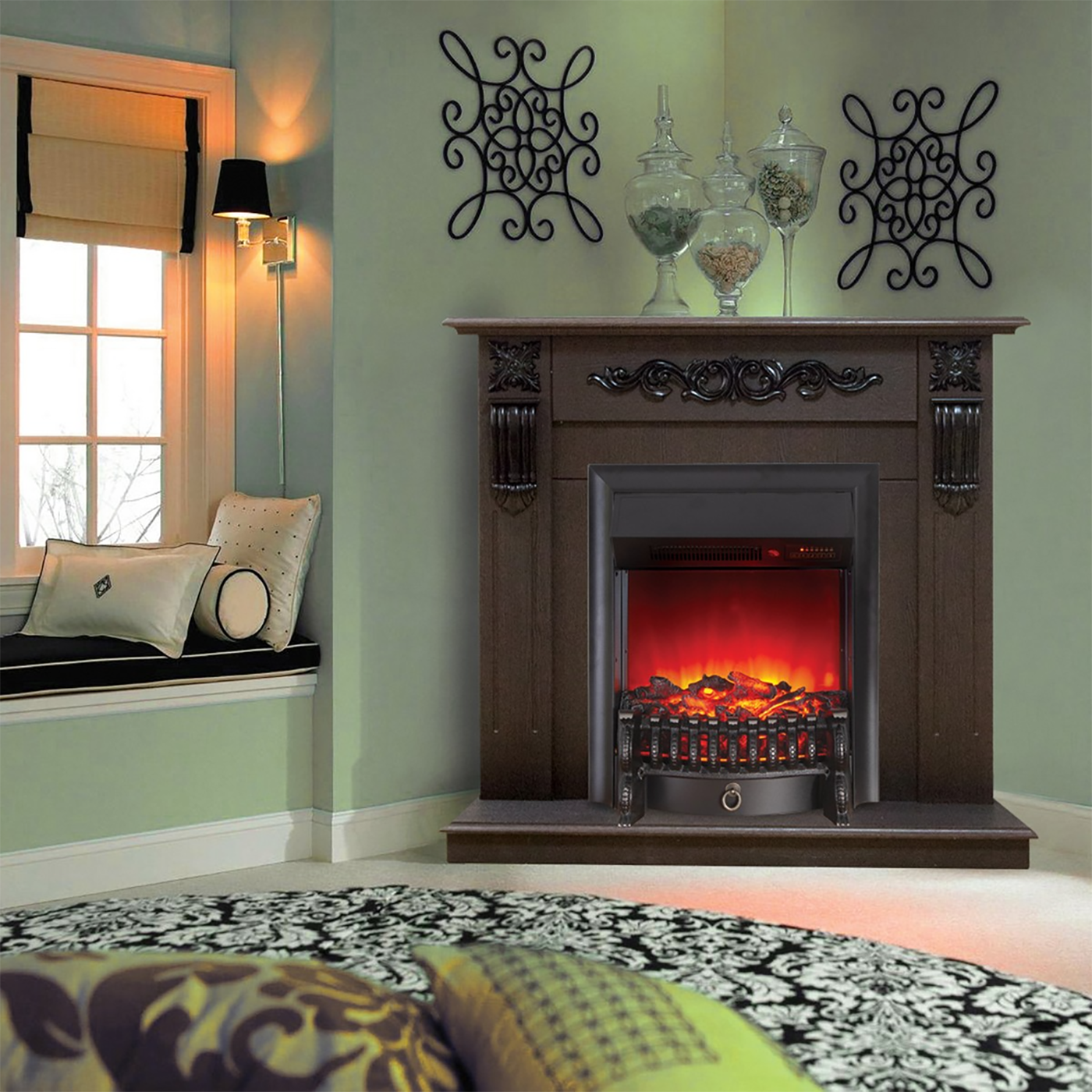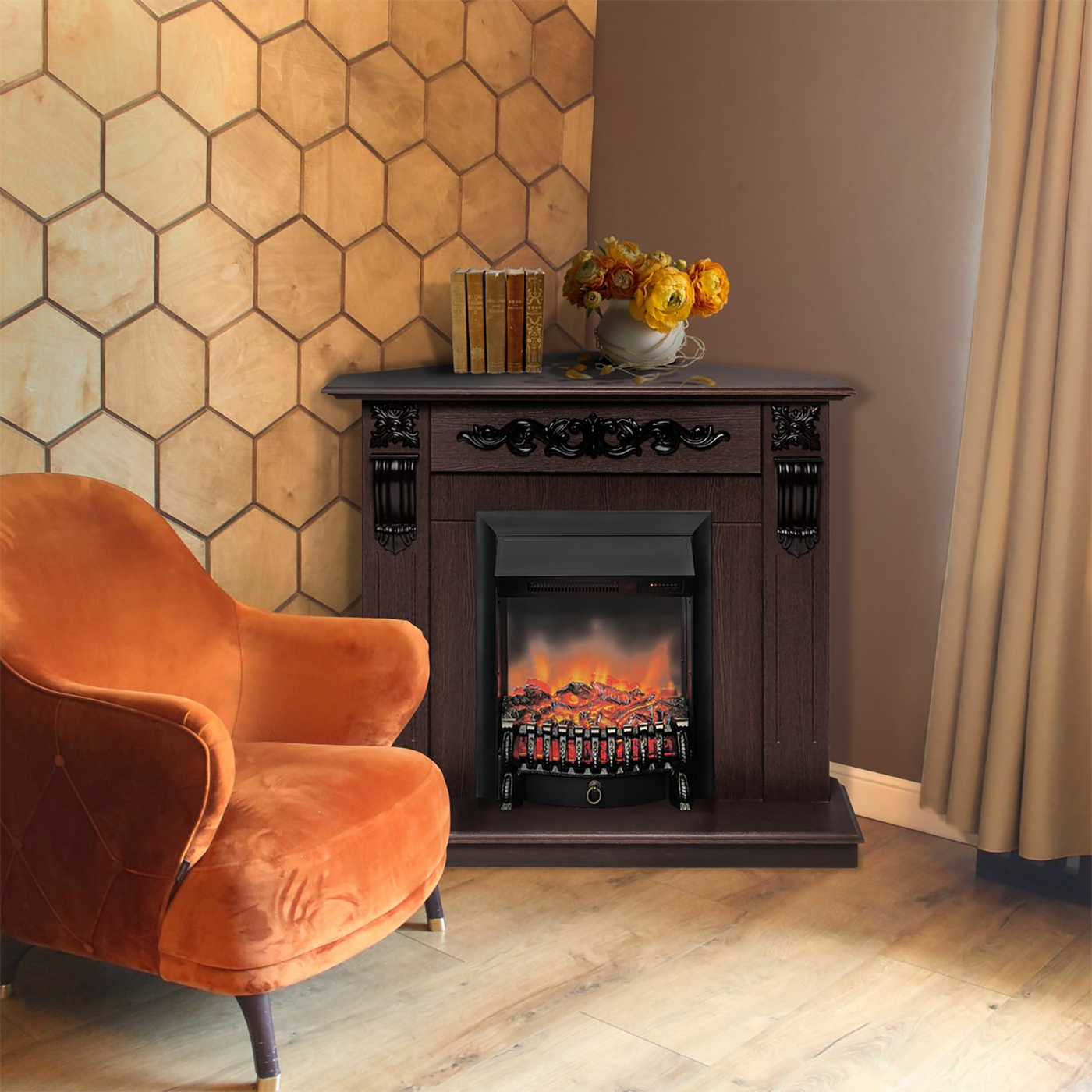 Обрамление Dominica Corner в двух расцветках (темный орех DN-F817), изготовлен из МДФ +пленка ПВХ , комплектуется со стандартным очагом Fobos S Lux, очаг с звуковым эффектом горения дров (регулируется) предназначен для встраивания в стандартные обрамления. Эффект пламени - сгоревшие дрова. Черная решетка имитирует колосниковую решетку настоящего дровяного камина. Два варианта рамки вокруг очага: черная или золотая. Нагреватель с поддувом спрятан в козырьке очага и обеспечивает обогрев в холодную погоду. Переключатель позволяет включать на полную или половинную мощность.