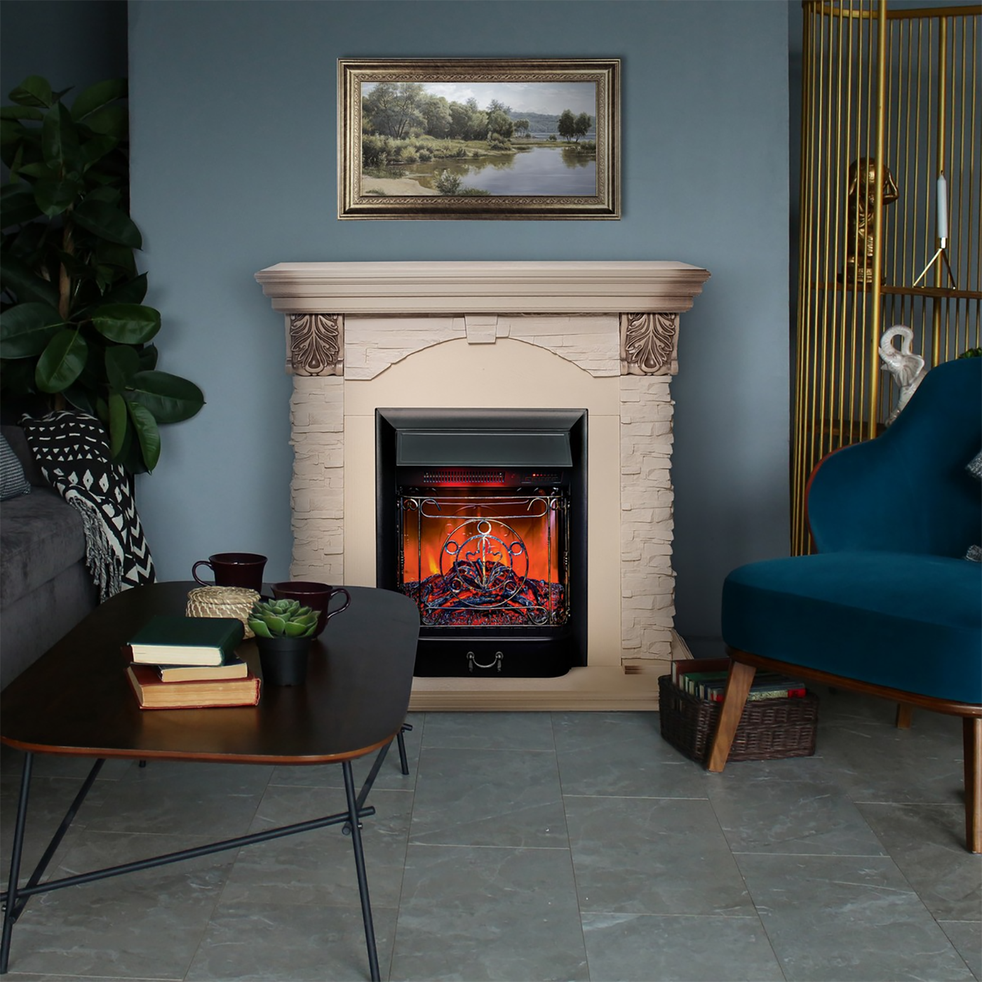 Электрический очаг Majestic Lux предназначен для встраивания в стандартные обрамления. В качестве муляжа - сгоревшие дрова. Нагреватель с поддувом спрятан в козырьке очага и обеспечивает обогрев в холодную погоду. Переключатель позволяет включать на полную (1 500 Вт) или половинную (750 Вт) мощность. В режиме визуализации пламени потребление электроэнергии составляет 80 Вт (две свечеобразные лампы E14 мощностью 40W)
