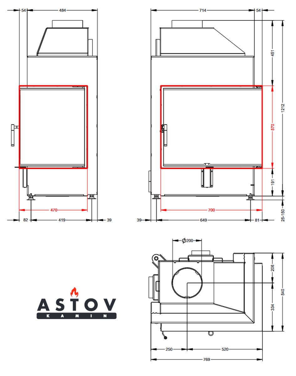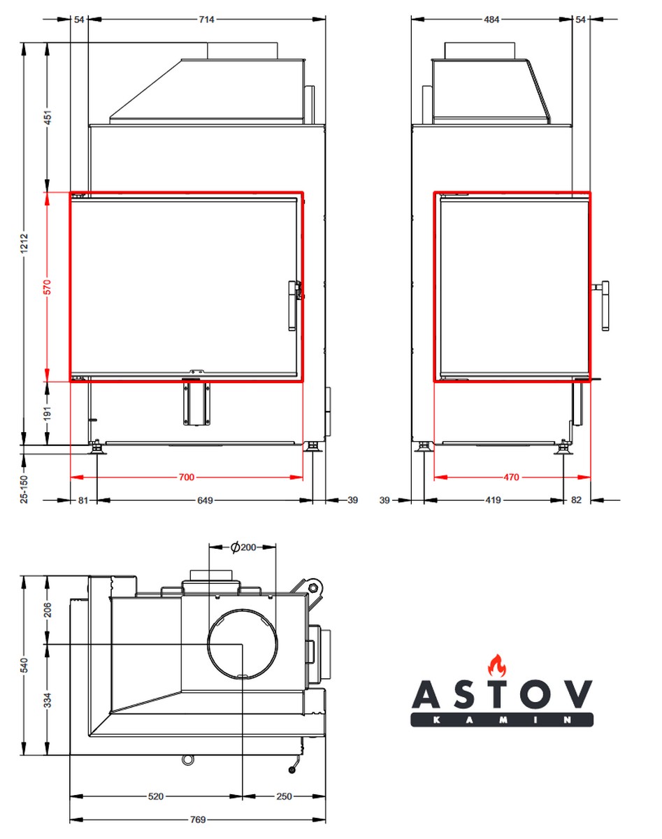 Каминная топка АСТОВ П2С 700 L/P - левый и правый вариант углового расположения