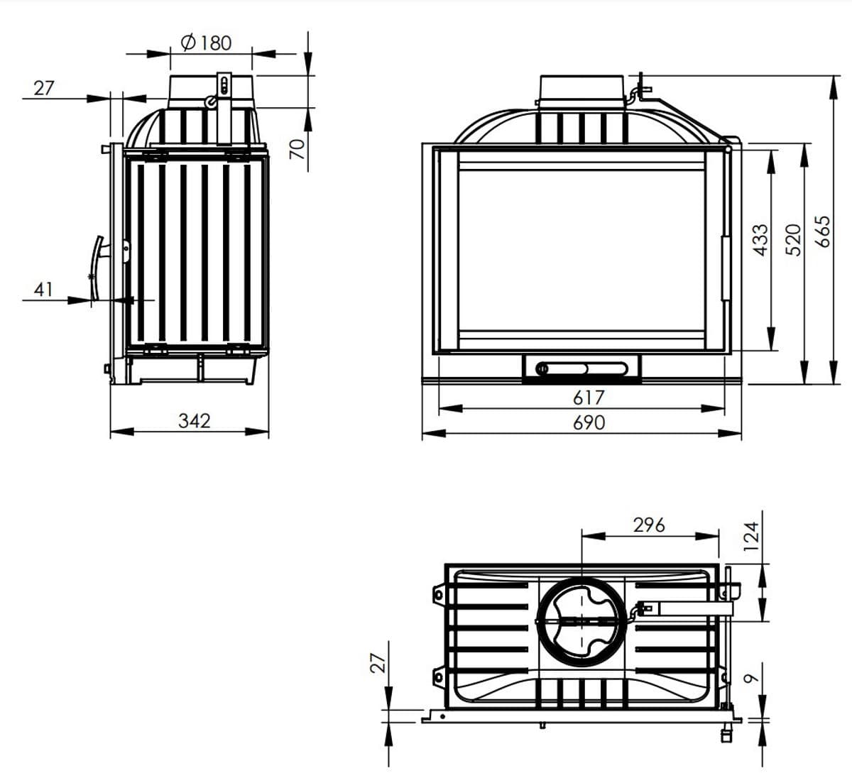 Тыльная сторона топки Corno оснащена двойной чугунной стенкой. Задняя стенка у каминных топок подвержена максимальной термической нагрузке. Дополнительная сменная внутренняя чугунная пластина защищает основной корпус топки от разрушения при чрезмерных нагрузках. Nordflam Corno укомплектована чугунной колосниковой решеткой и зольным ящиком, а на фасаде топки расположена стильная заслонка первичной подачи воздуха под колосник.