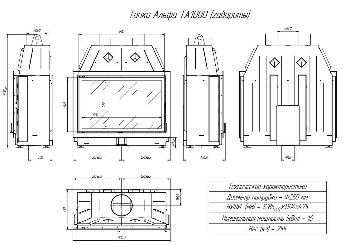 Размеры Альфа 1000 N подовая, Ш×В×Г: 1104×1250×475 мм.