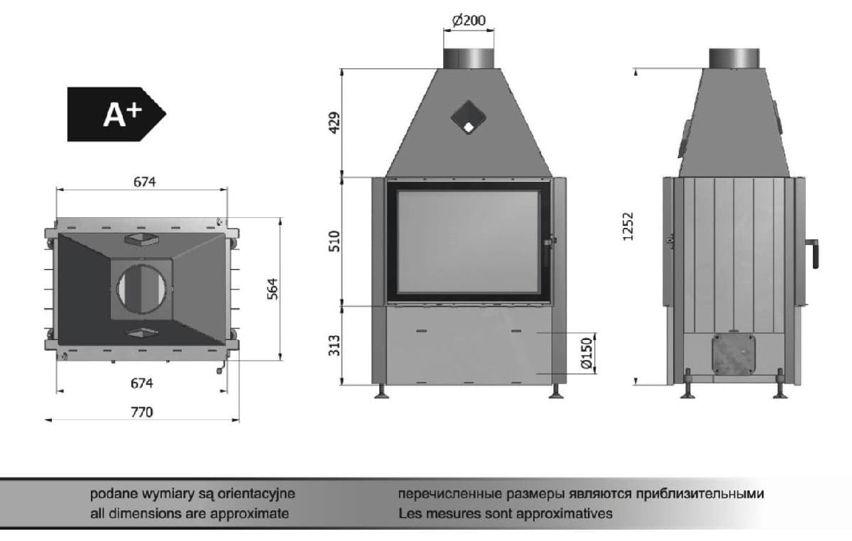 - Диаметр подключения дымохода:200 мм