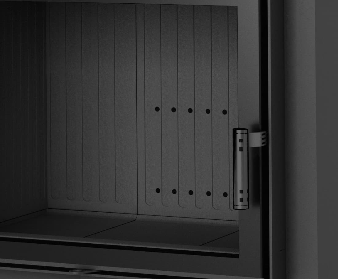 Дверца выполнена в современном стиле «Full Glass» (Полное остекление), в котором видимость стальных элементов сведена к минимуму. Из-за такой формы очаг визуально кажется больше, чем он есть на самом деле. Дверца имеет эргономичную вентилируемую ручку из нержавеющей стали для открывания в сторону.