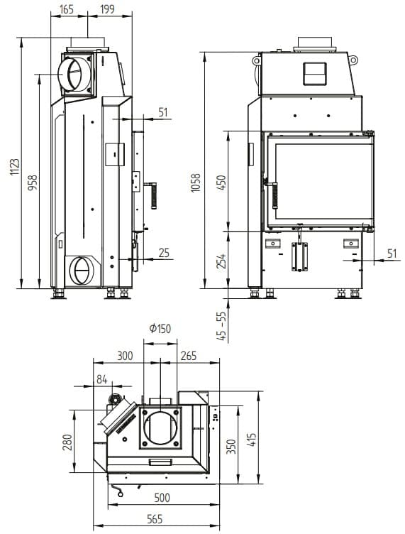 Габаритные размеры Каминная топка ECKA 50/35/45R правосторонняя