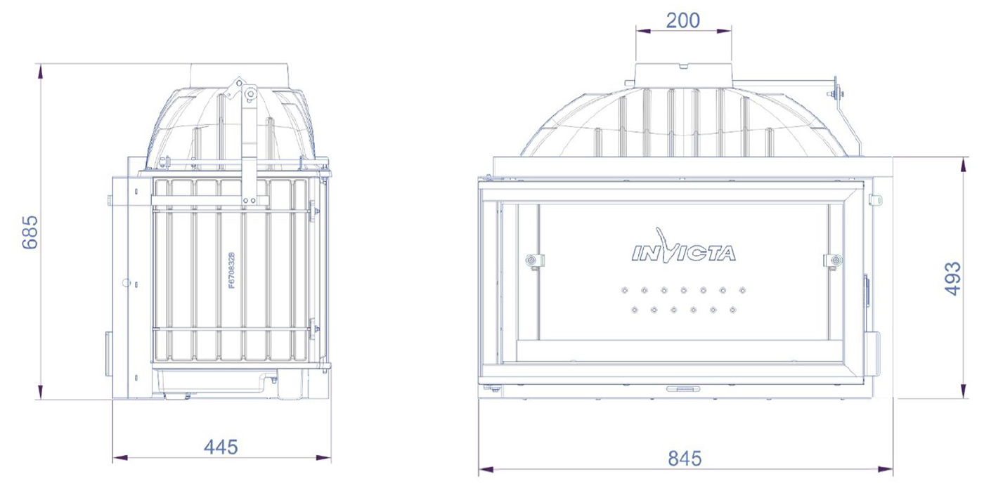 Модель оборудована дымосборником и шиберной заслонкой. Стекло составное декорированное черной фабричной тонировкой по краю - шелкографией. Задняя стенка у угловой чугунной топки Invicta 700 двойная с отверстиями для подачи воздуха на вторичный дожиг.