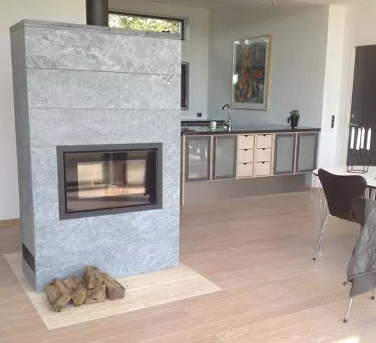 Jydepejsen Sigma Duplex Titan - туннельная каминная вставка с отделкой из талькохлорита.