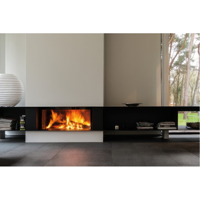 LUNA DIAMOND (+) Wood 1300 H — это встраиваемый горизонтальный дровяной камин с передней подъемной дверцей, предназначенный для интеграции в каминный портал или специальную нишу. Его лаконичный дизайн из черного металла и керамического стекла позволяет создать бесшовную и современную отопительную систему. Модель предлагает полную индивидуальную настройку за счет выбора декоративных рамок для идеального сочетания с отделкой интерьера.
