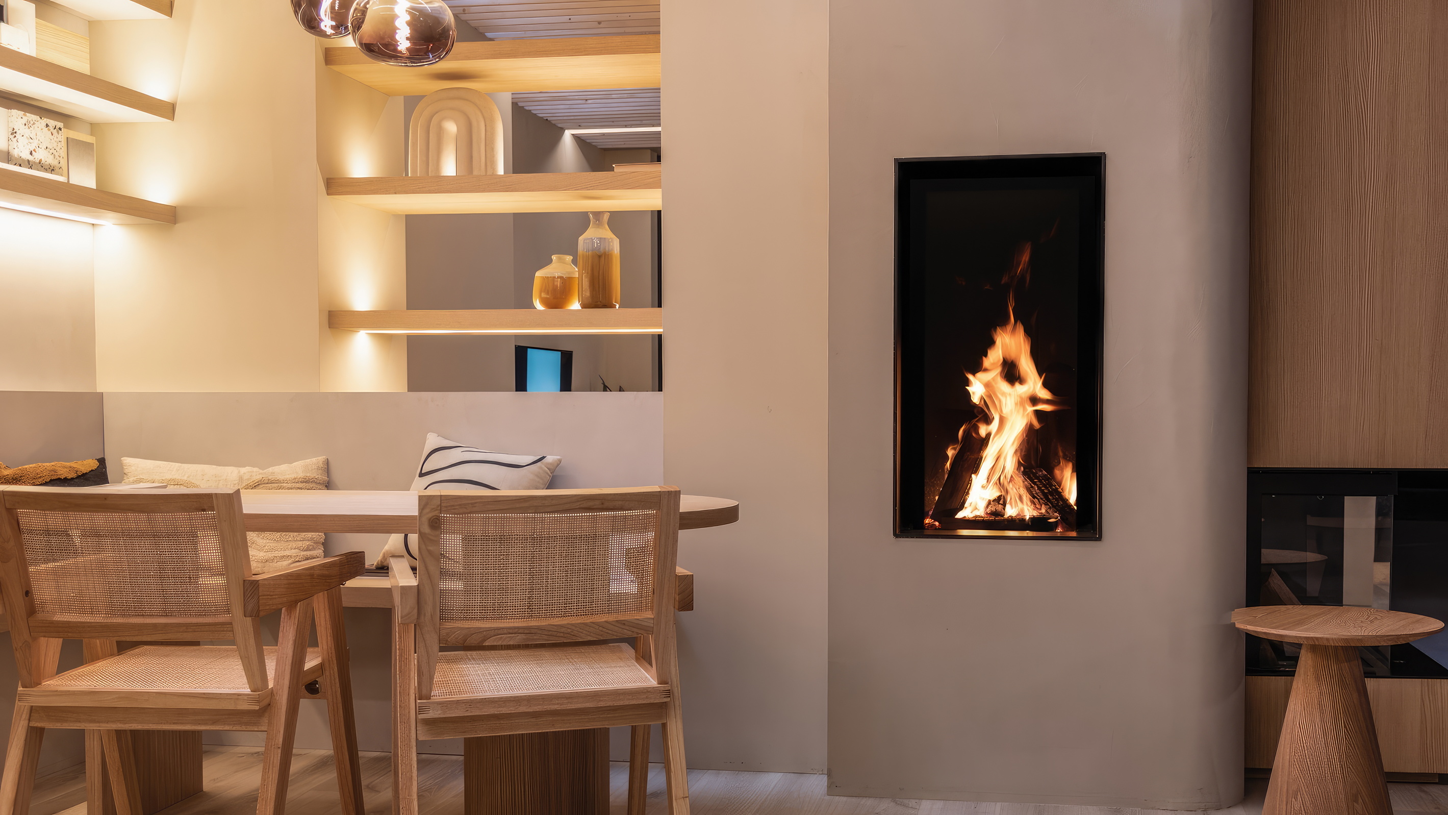 Безупречная эстетика: Полное отсутствие видимой рамы (Pure Face) создает эффект открытого очага, встроенного прямо в стену.