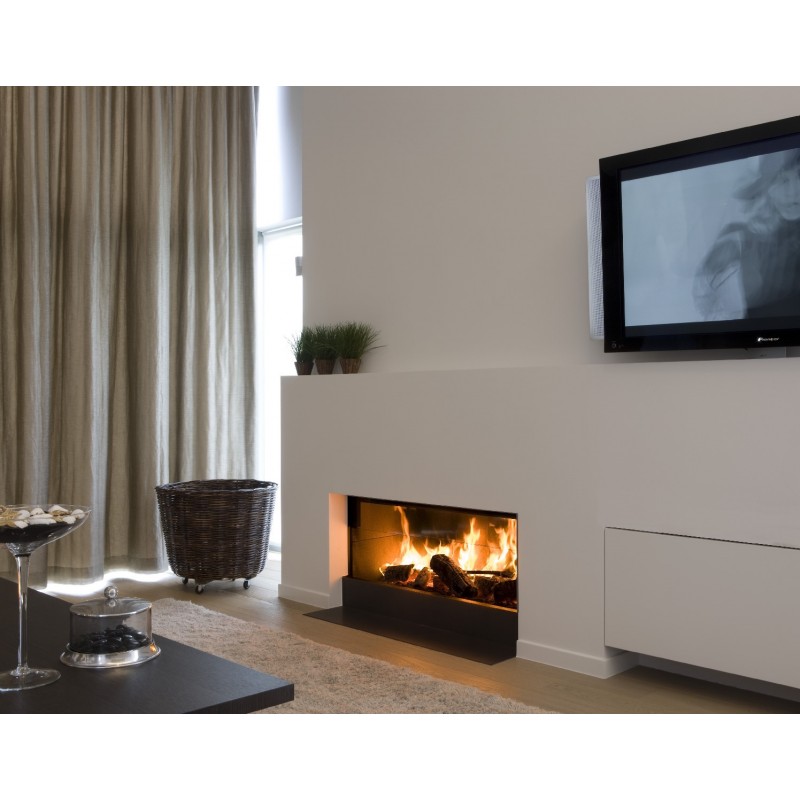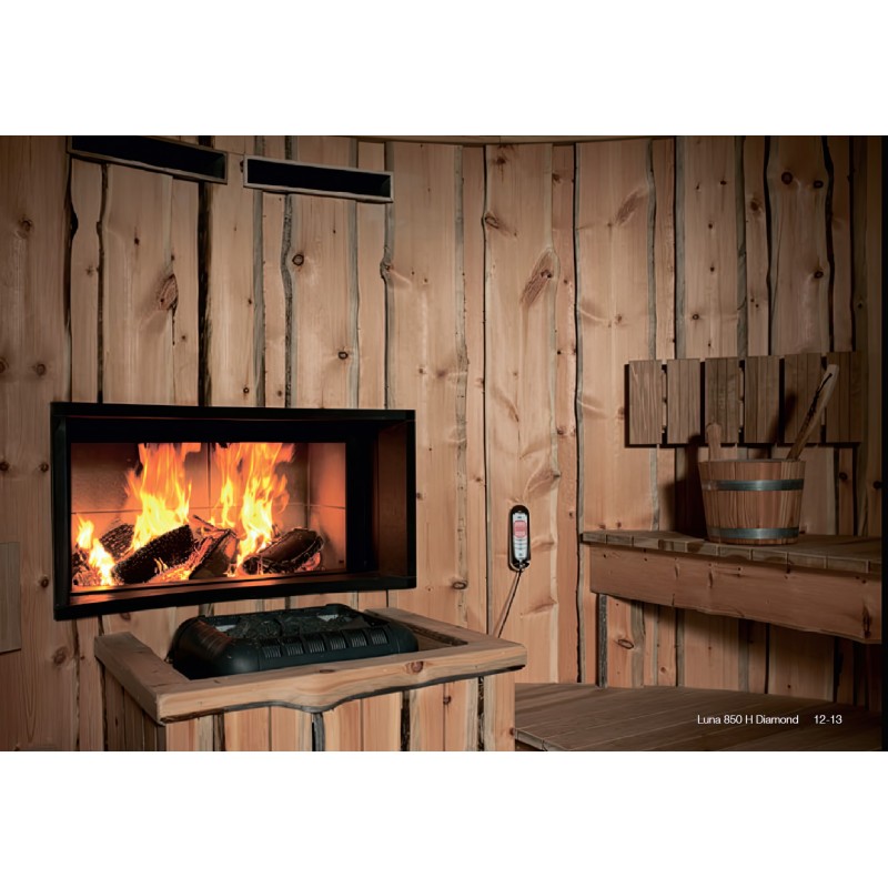 Luna 850 H Diamond (Plus) — это современная каминная вставка на дровах с подъемной дверцей и автоматическим управлением (система Swipe для смартфона/планшета), предназначенная для встроенной установки. Модель из серии Diamond Plus отличается бескаркасным панорамным стеклом, искрогасителем и высокой эффективностью горения, обеспечивая чистый обзор огня и равномерный нагрев.