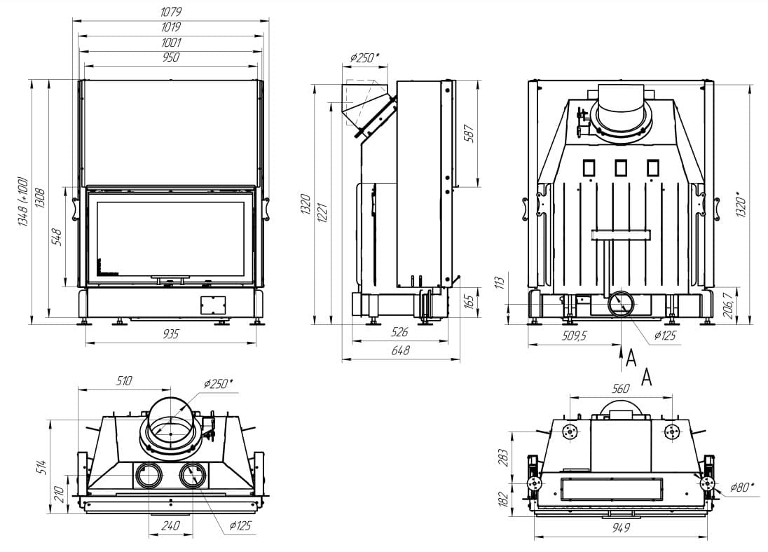 Устойчивые, регулируемые по высоте ножки (100 мм), позволяют при монтаже установить топку по уровню.