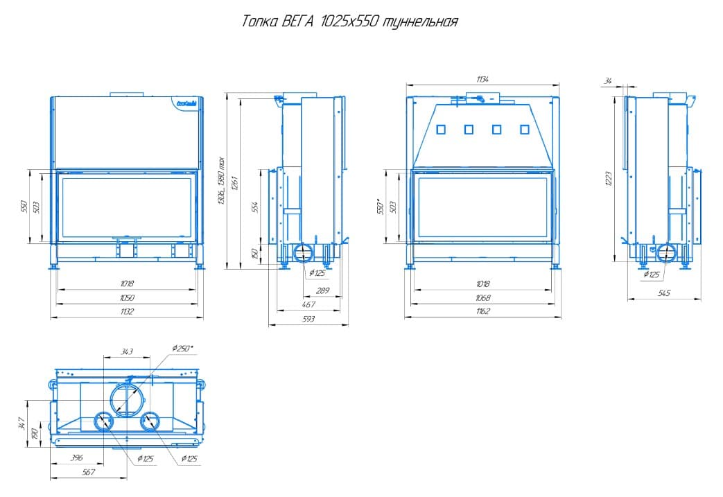 Каминная топка ВЕГА 1000 TB туннельная черный шамот чертеж: