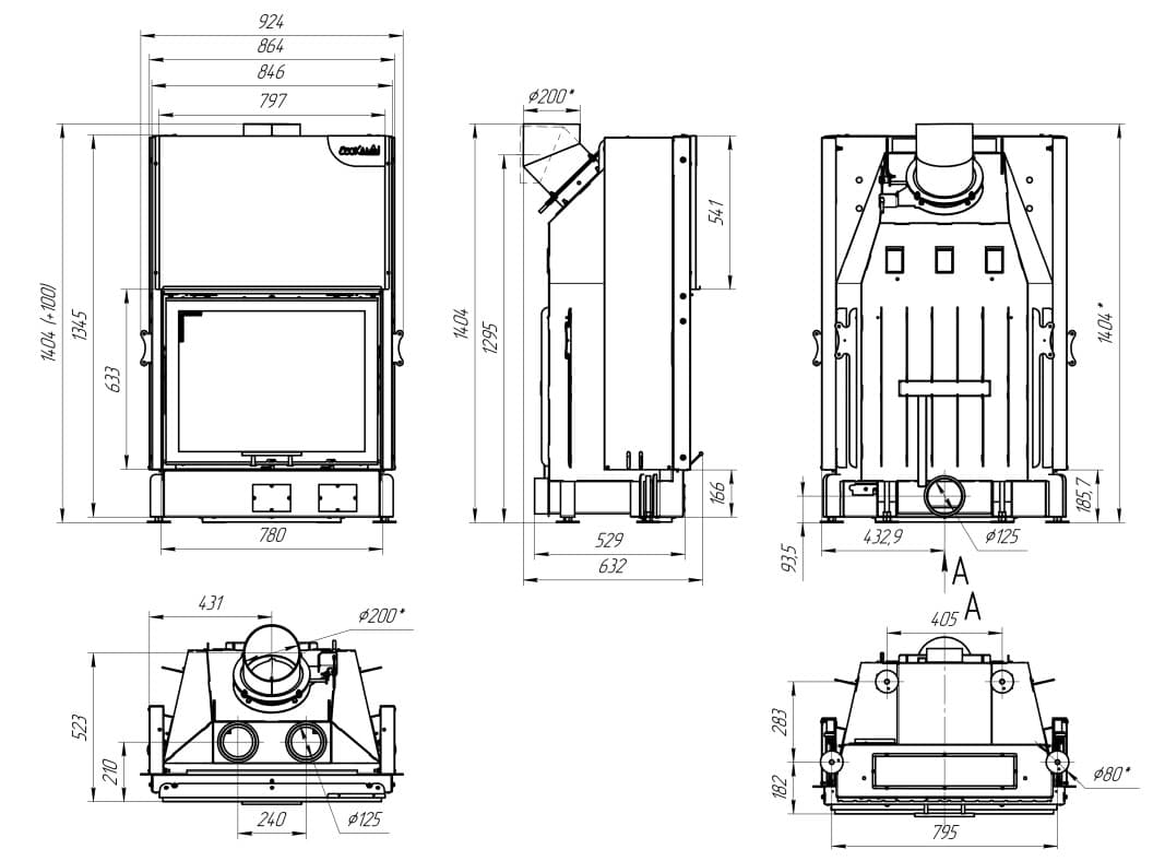 Каминная топка ВЕГА 800 В принтинг чертеж: