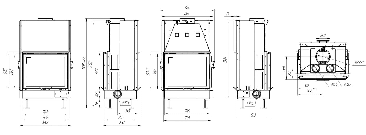 Ребра жесткости по всему корпусу топки и встроенные в дымосборник тепловые каналы позволяют снимать больше тепла и отдавать его в помещение путем конвекции. Высокий дымосборник и пламярассекатель не позволяют дымовым газам попадать в помещение при открывании дверцы.