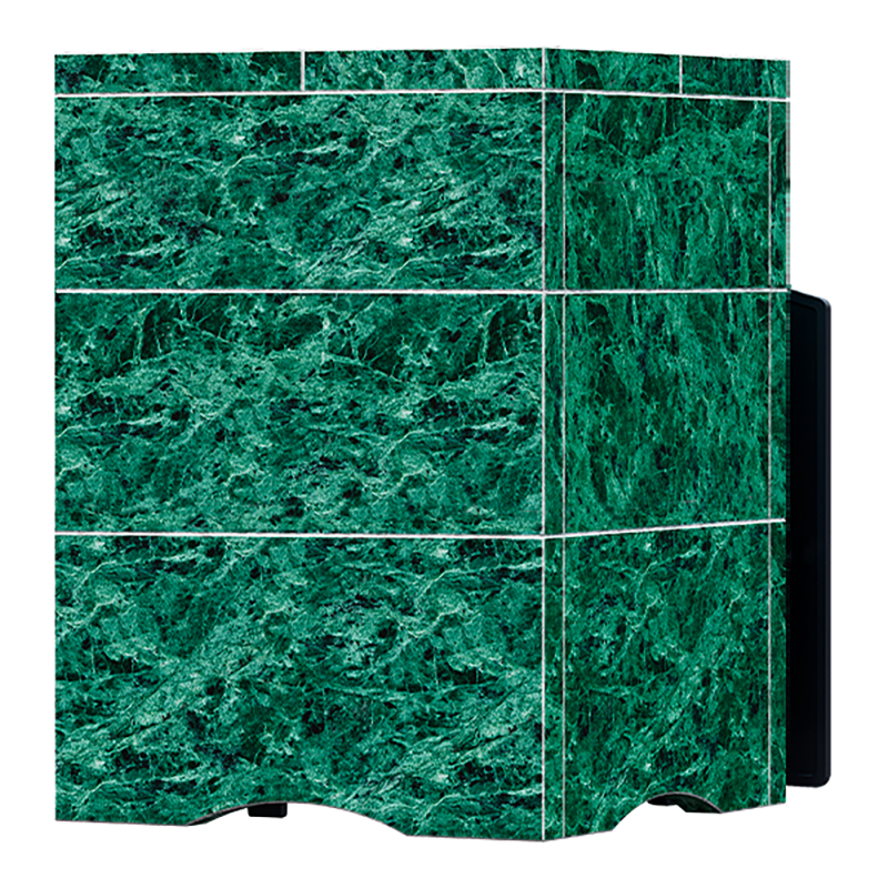 Облицовка из кирпичиков змеевика - это простой и эффективный способ создать режим русской бани. Облицовка представляет собой плитки зелёного камня с краями, обработанными фаской. Из-за этих краёв облицовка имеет чёткий рисунок, который полностью имитирует настоящую кирпичную кладку. Эта облицовка также, как и облицовка из классического кирпича, останавливает жёсткое инфракрасное излучение и конвекцию, легко собирается/разбирается и не требует никаких специальных навыков при сборке.