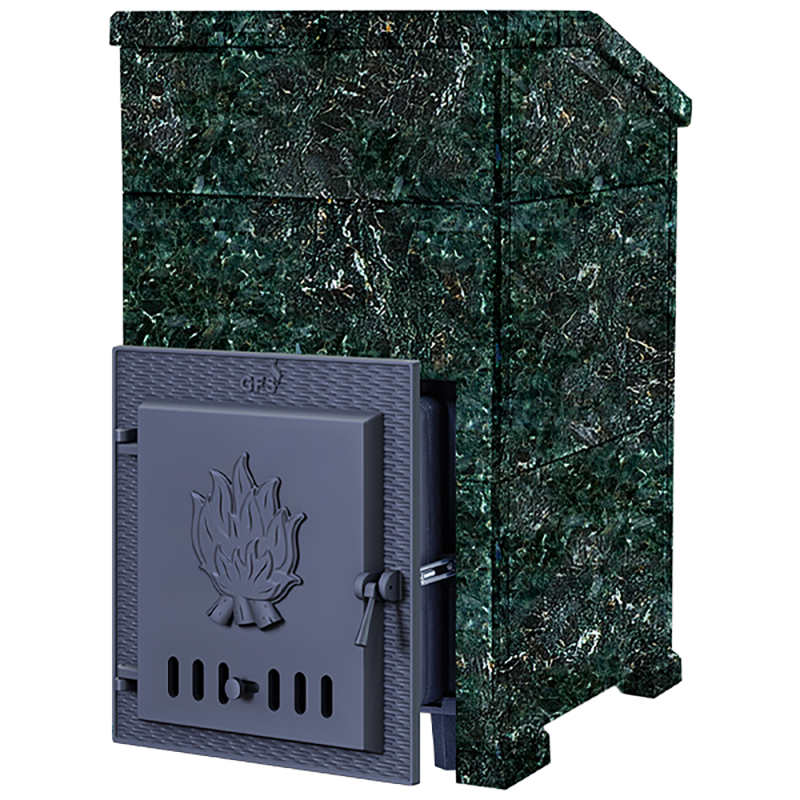Комплект GFS Гефест ЗК 25(П)2 Президент 980/40 Пироксенит - печь с усиленной каменкой большей массы, с единым углублением внутрь топки для дополнительной укладки чугунного заряда. Теплосъемные шипы со стороны горения пламени в разы увеличивают площадь соприкосновения огня с каменкой и ускоряют передачу тепла, а также способствуют лучшему дожигу, смешивая потоки пламени и воздуха, поступаемого из воздушника. Эти усовершенствования значительно повышают мощность парообразования печи и выдают большее количество пара при непрерывной подаче воды. Каменка печей GFS Гефест-ЗК является незаливаемой.