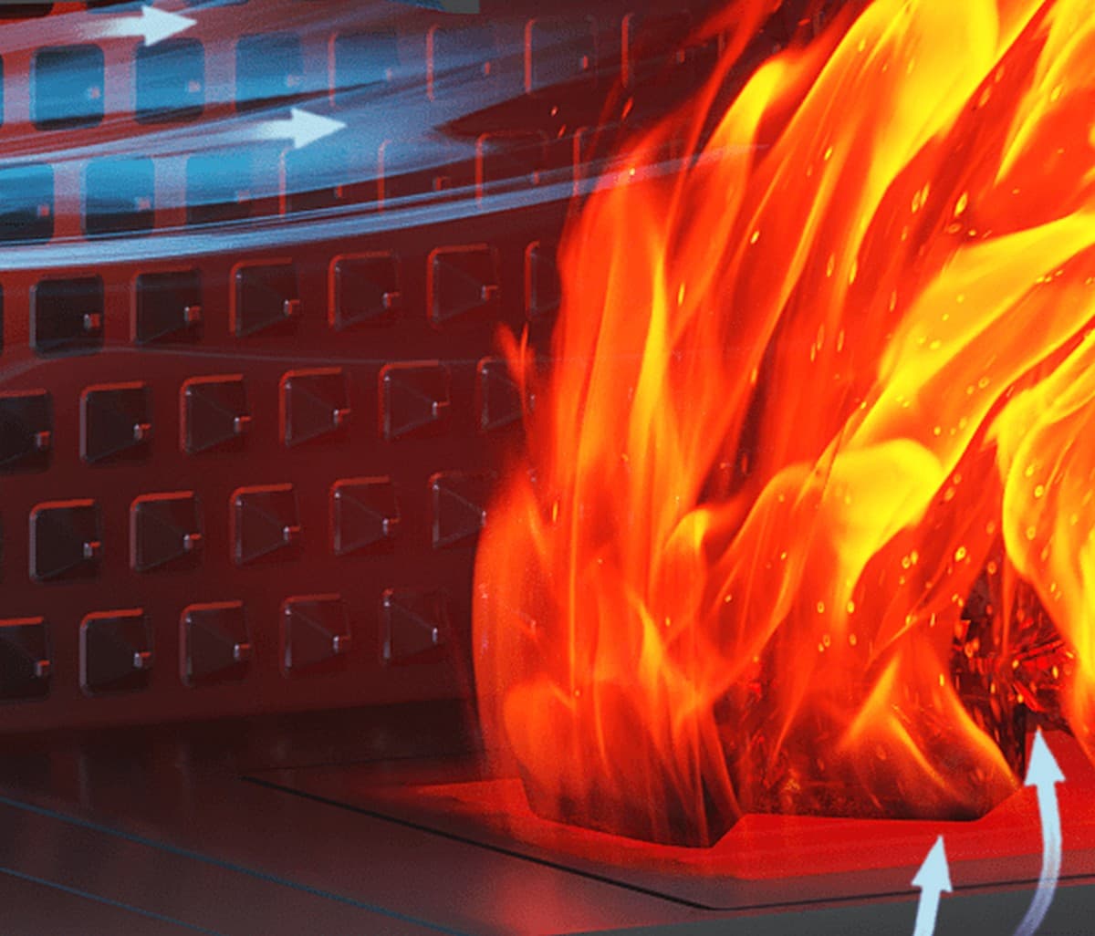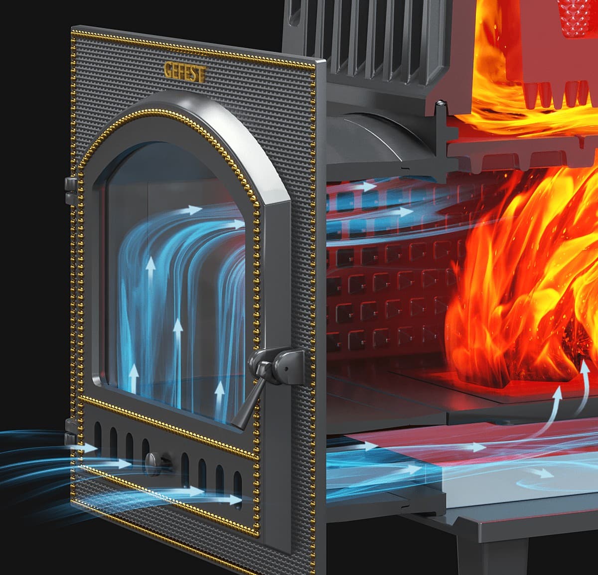 Благодаря направленной конвекции воздушного потока, происходит очистка стекла, на его поверхности не оседает сажа и копоть, стекло долгое время остается полностью чистым и прозрачным.