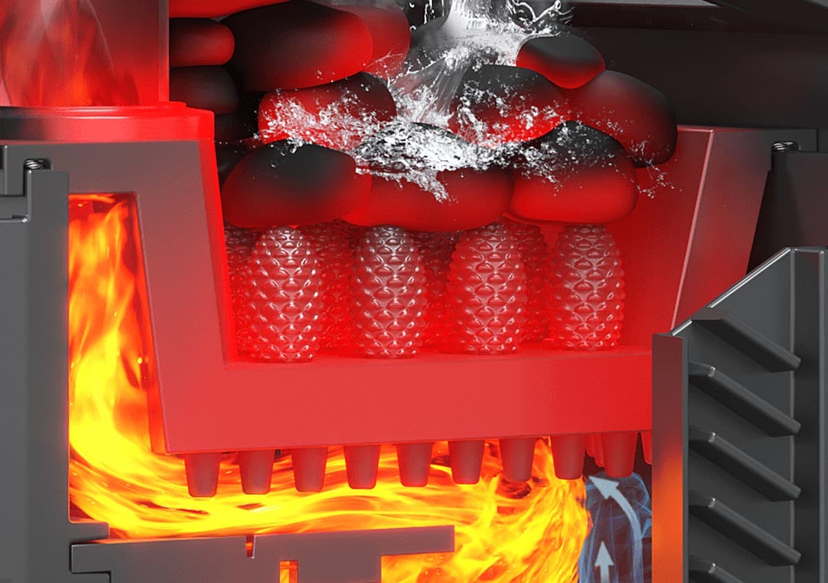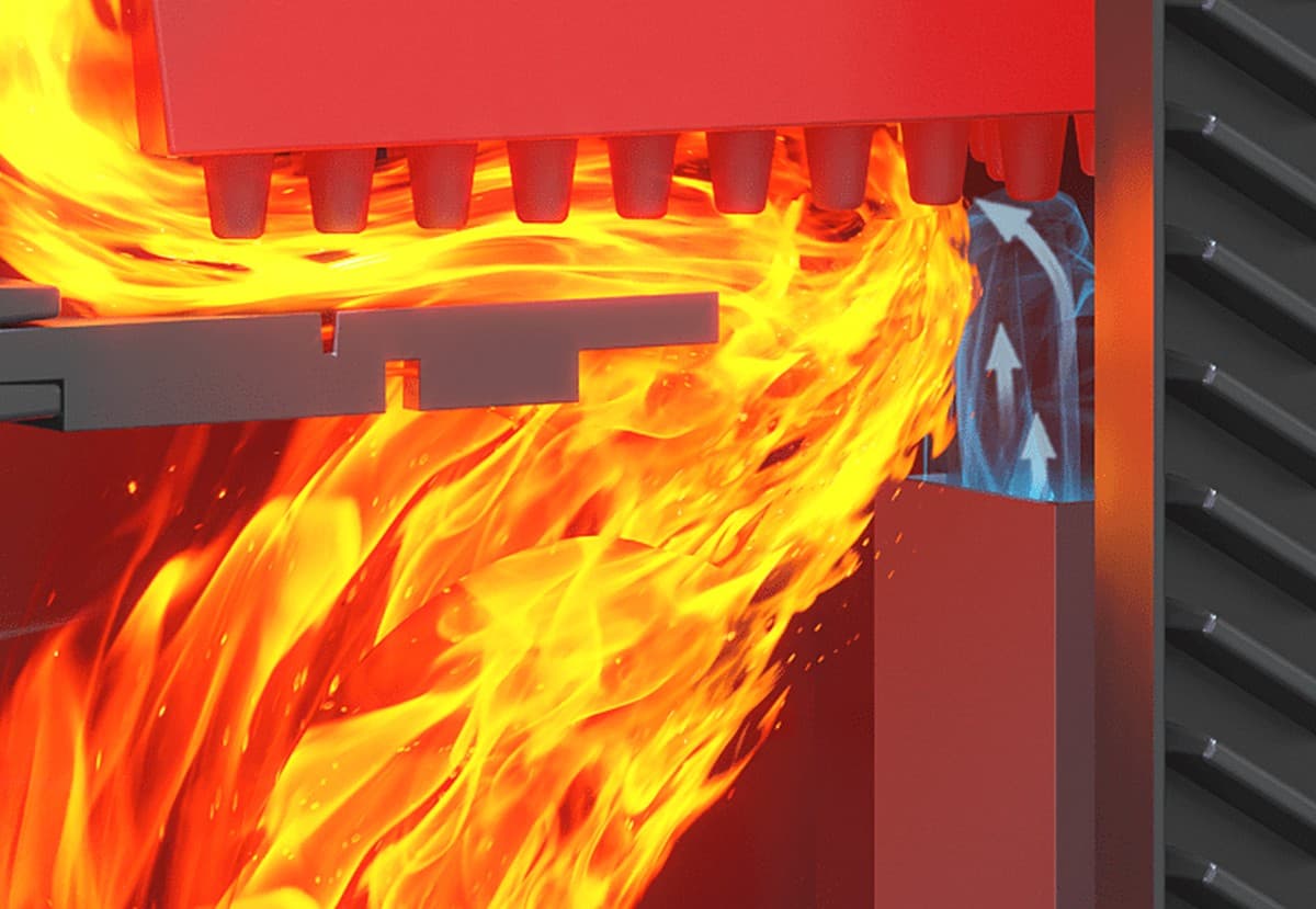 Во второй камере топки с помощью потока воздуха происходит дожиг пиролизных газов, благодаря чему повышается температура горения, что увеличивает КПД печи до 90 процентов.
