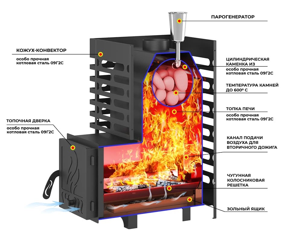 Стальной кожух-конвектор значительно ускоряет нагревание воздуха в парилке за счет образуемого им мощного воздушного потока.