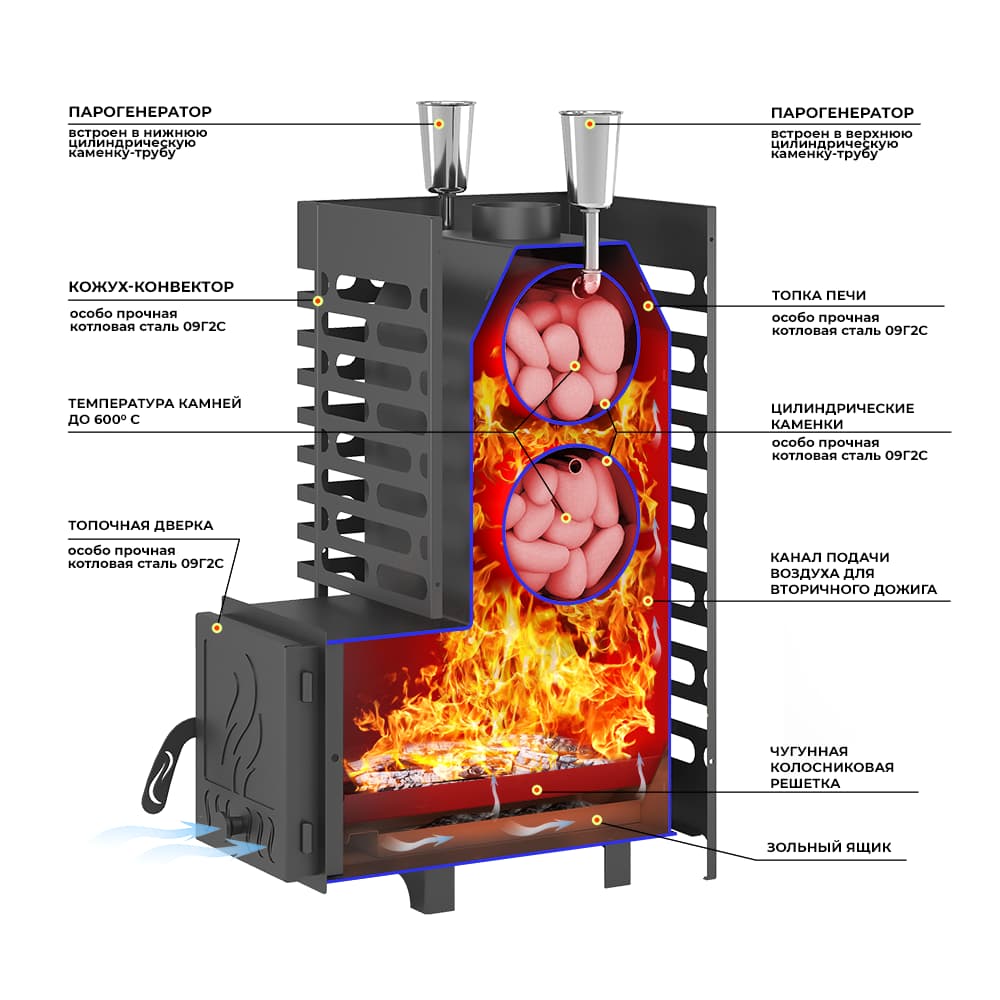 Глубокая невентилируемая каменка-труба из стали 09Г2С толщиной 4 мм прогревается открытым пламенем для максимального нагрева камней, заложенных в нее и выполняет роль пламегасителя.