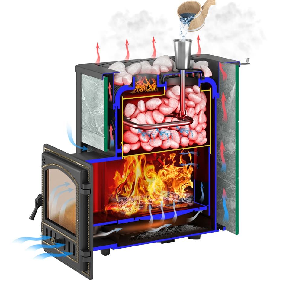 Закрытая каменка расположена внутри топки, что ускоряет разогрев заложенного камня и нагревает камень до температур 550-600 градусов.