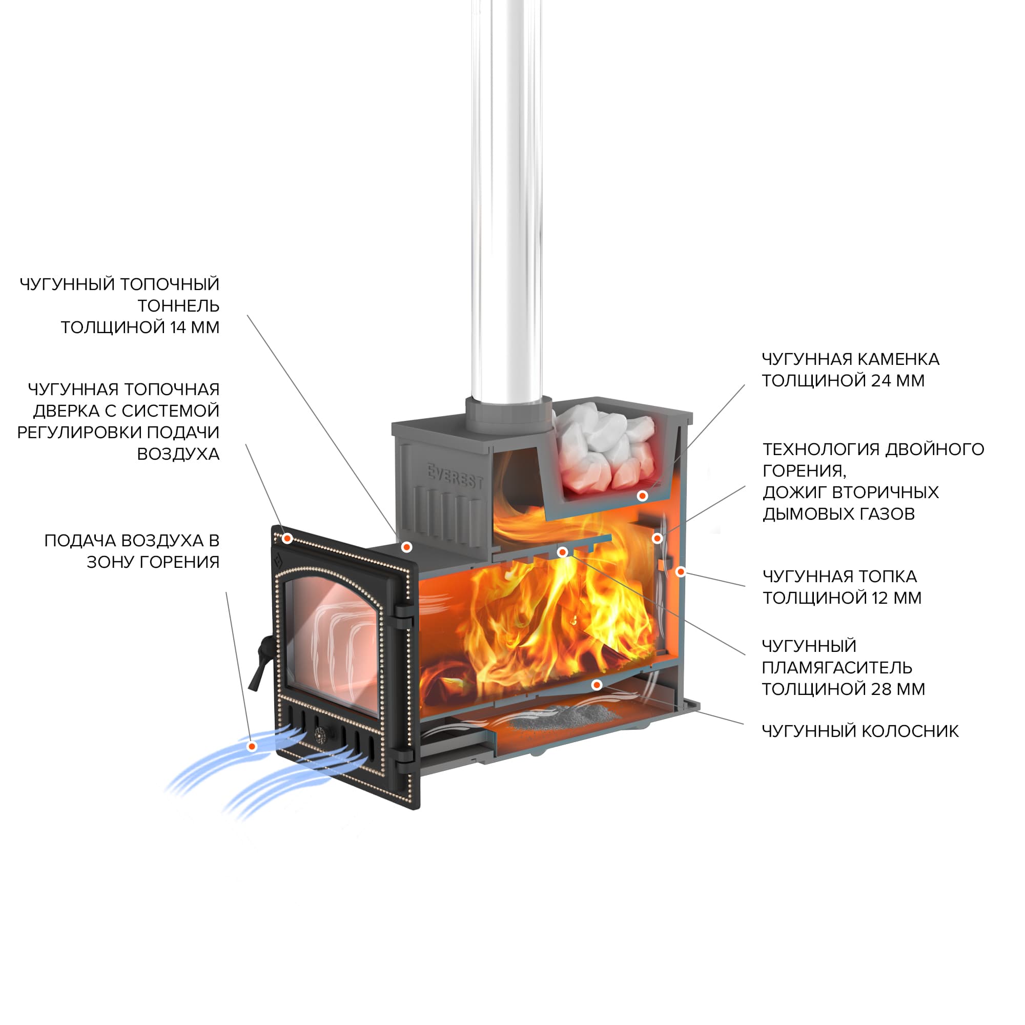 Большая мощность, эстетичный внешний вид, высокая теплоёмкость, вместительная каменка – вот ключевые отличия сборной чугунной печи Эверест 24.
