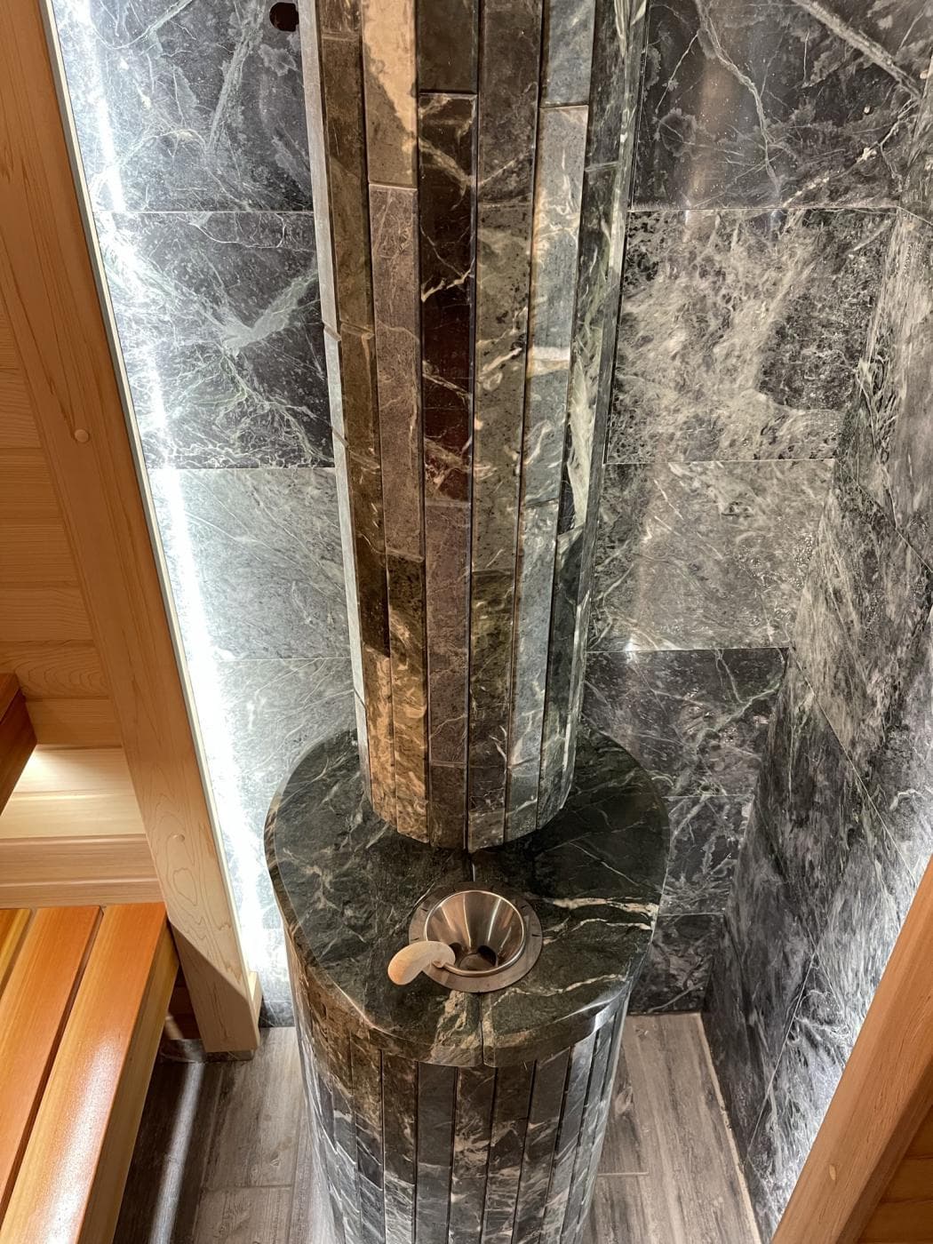 Не забудьте украсить дверцу печи декоративным Порталом в облицовке из натурального камня. В итоге у Вас будет не просто печь для бани, но и роскошный камин в комнате отдыха.