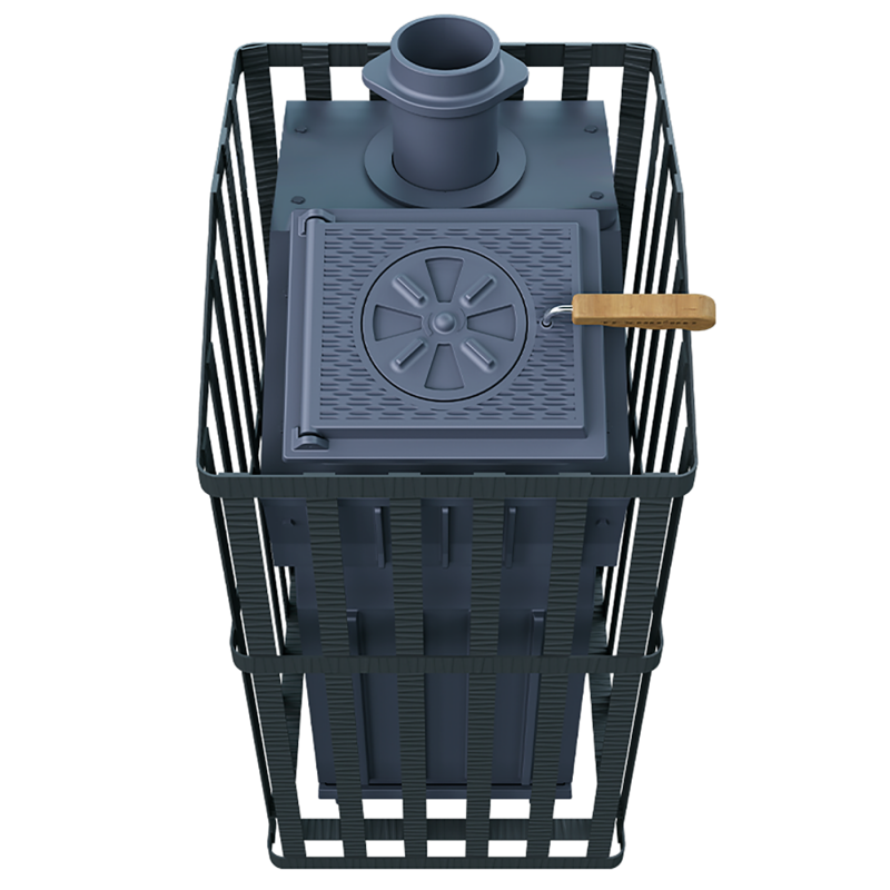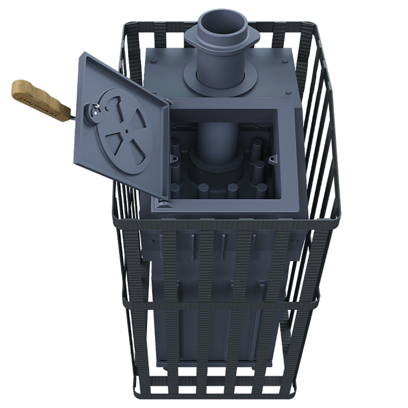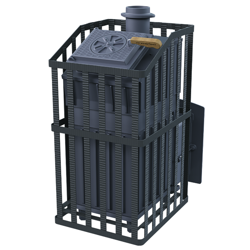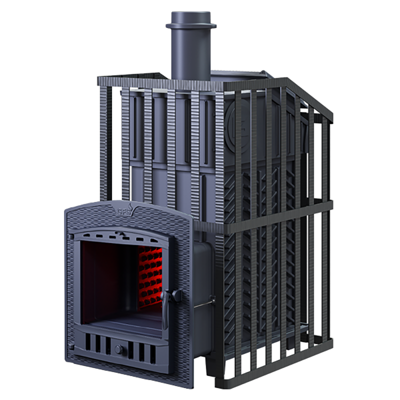 GFS Гефест ЗК Ураган 25 (П2) - расширенный комплект печи GFS Гефест ЗК в сетке. Максимально приближенный вариант печи для режимов русской парной, имеющий непосредственно закрытую чугунным коробом каменку, дверцу для пара с ручкой из бука, увеличенную до 50 см чугунную стартовую трубу. Печь легко модернизируется до полноценной печи предназначенной для Русской бани путем замены стальной сетки на каменную облицовку без демонтажа дымохода.