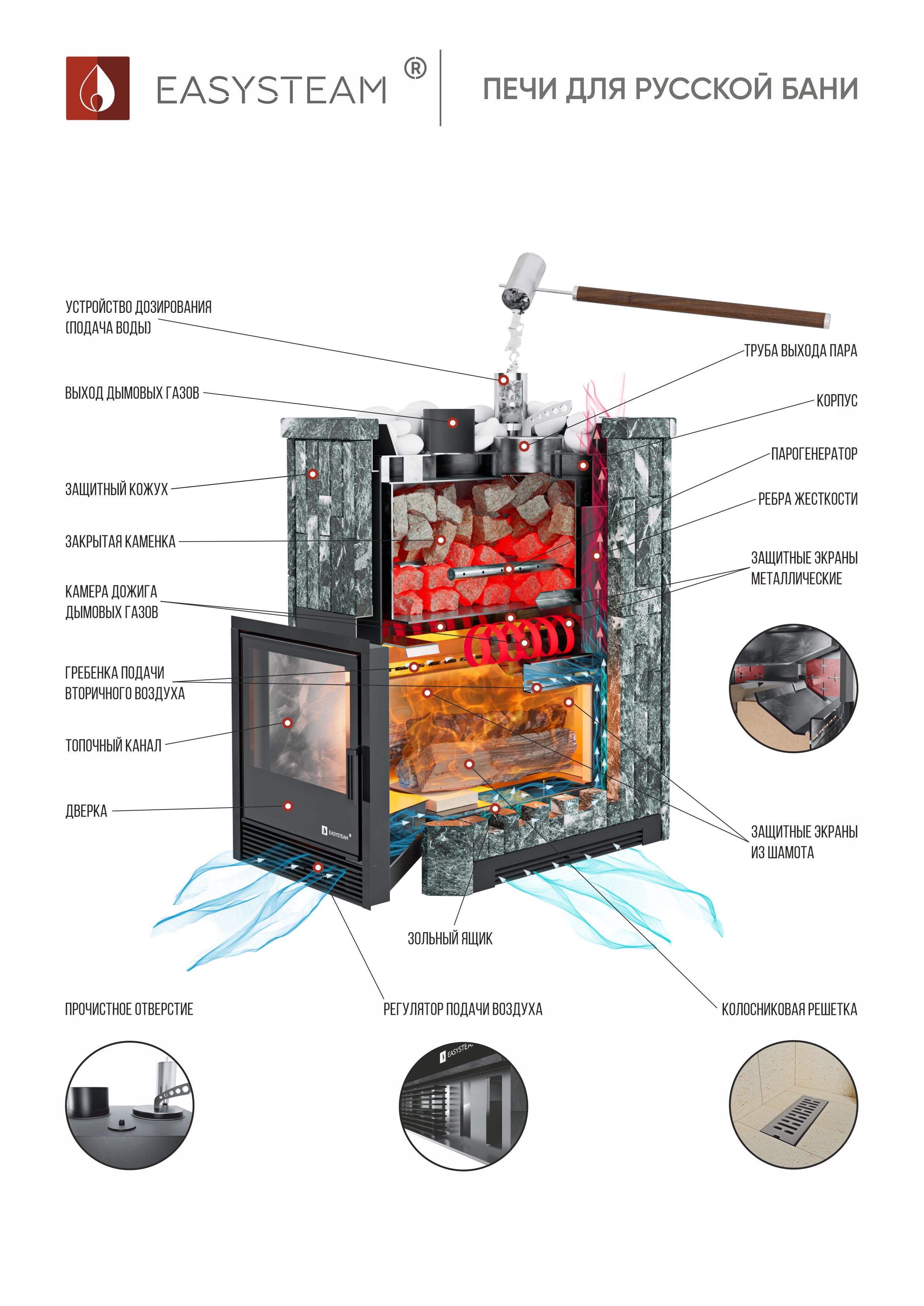 каменками, предназначена для нагрева парной, получения легкого пара и горячей воды. Вы