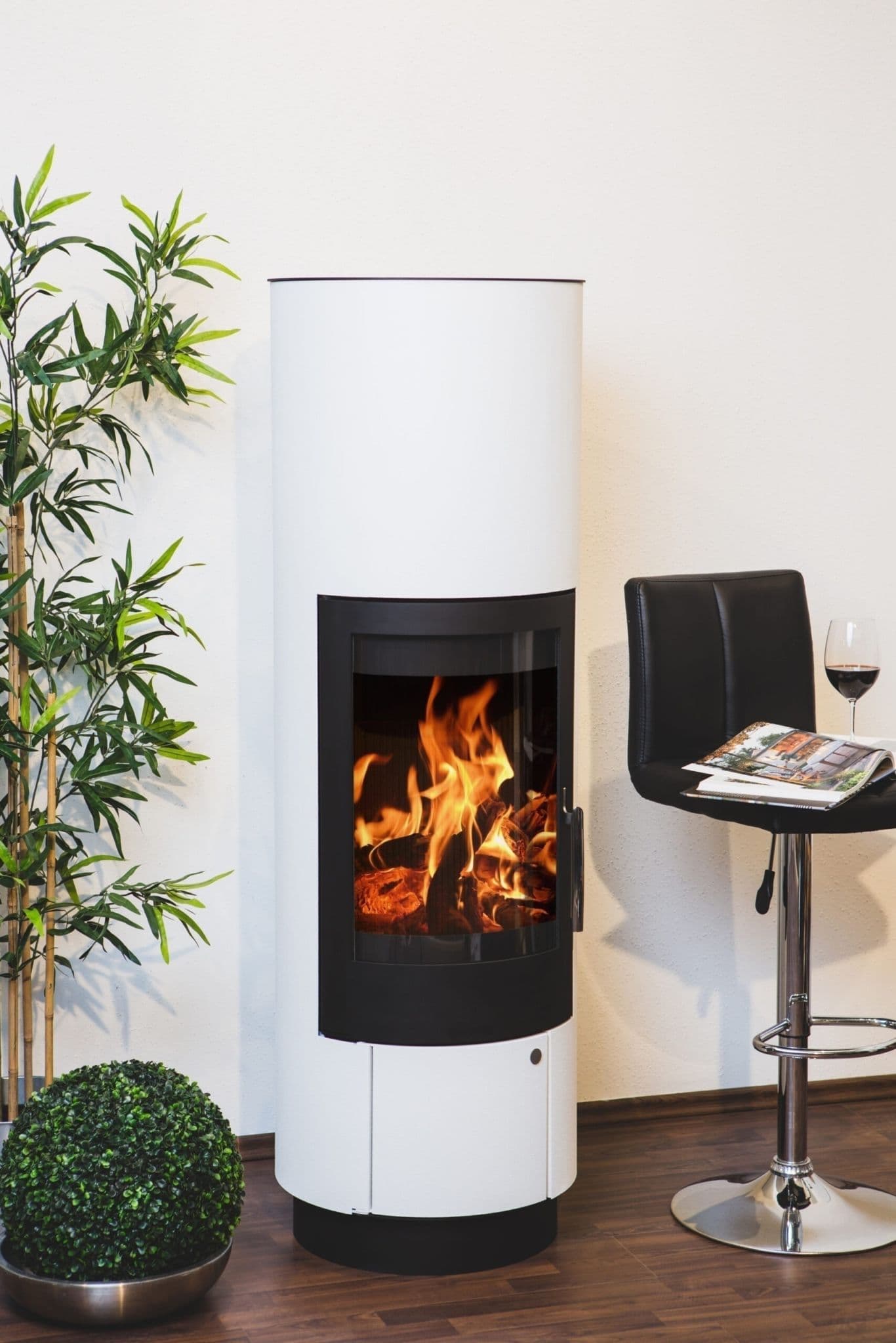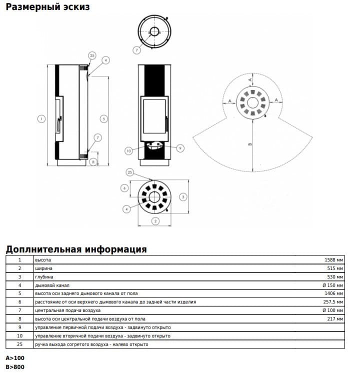 Корпус у печи цилиндрической формы с панорамным термостойким стеклом. Благодаря системе «Чистое стекло», на дверце долгое время не остается копоти и нагара и можно беспрепятственно наслаждаться игрой пламени.