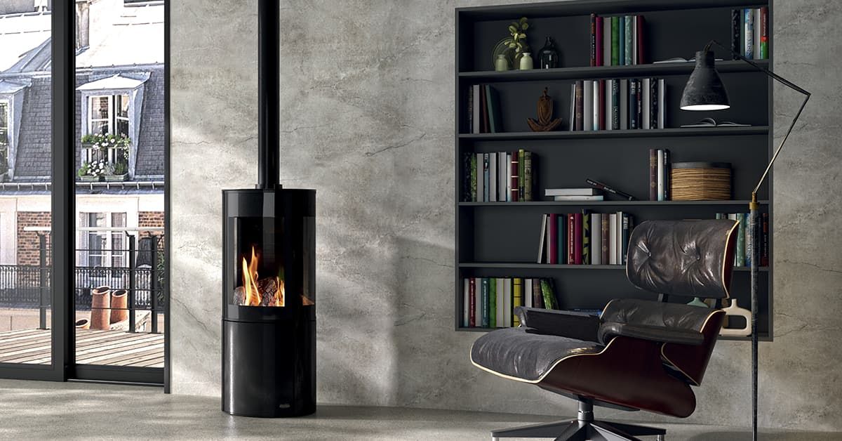 Каминная печь Cheminees Philippe Marsiac - овальная цилиндрическая дровяная печь с 3-х сторонним остеклением для настоящего удовольствия от вида огня.
