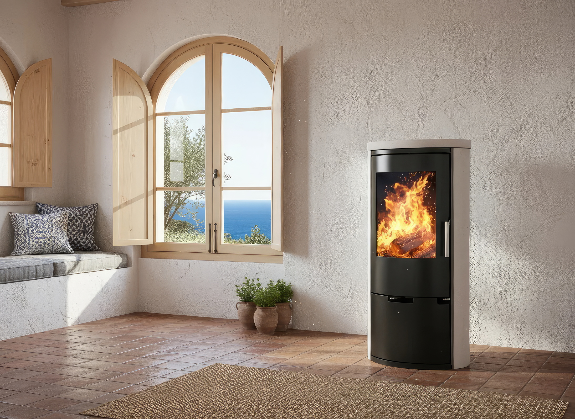 Корпус выполнен из котловой стали с термостойким покрытием. Топка футерована вермикулитом высокой плотности, что обеспечивает чистое сгорание и защищает сталь от прямого воздействия огня. Модель поддерживает подключение внешнего воздуха (CPV), что критически важно для домов с принудительной вентиляцией или высокой герметичностью.