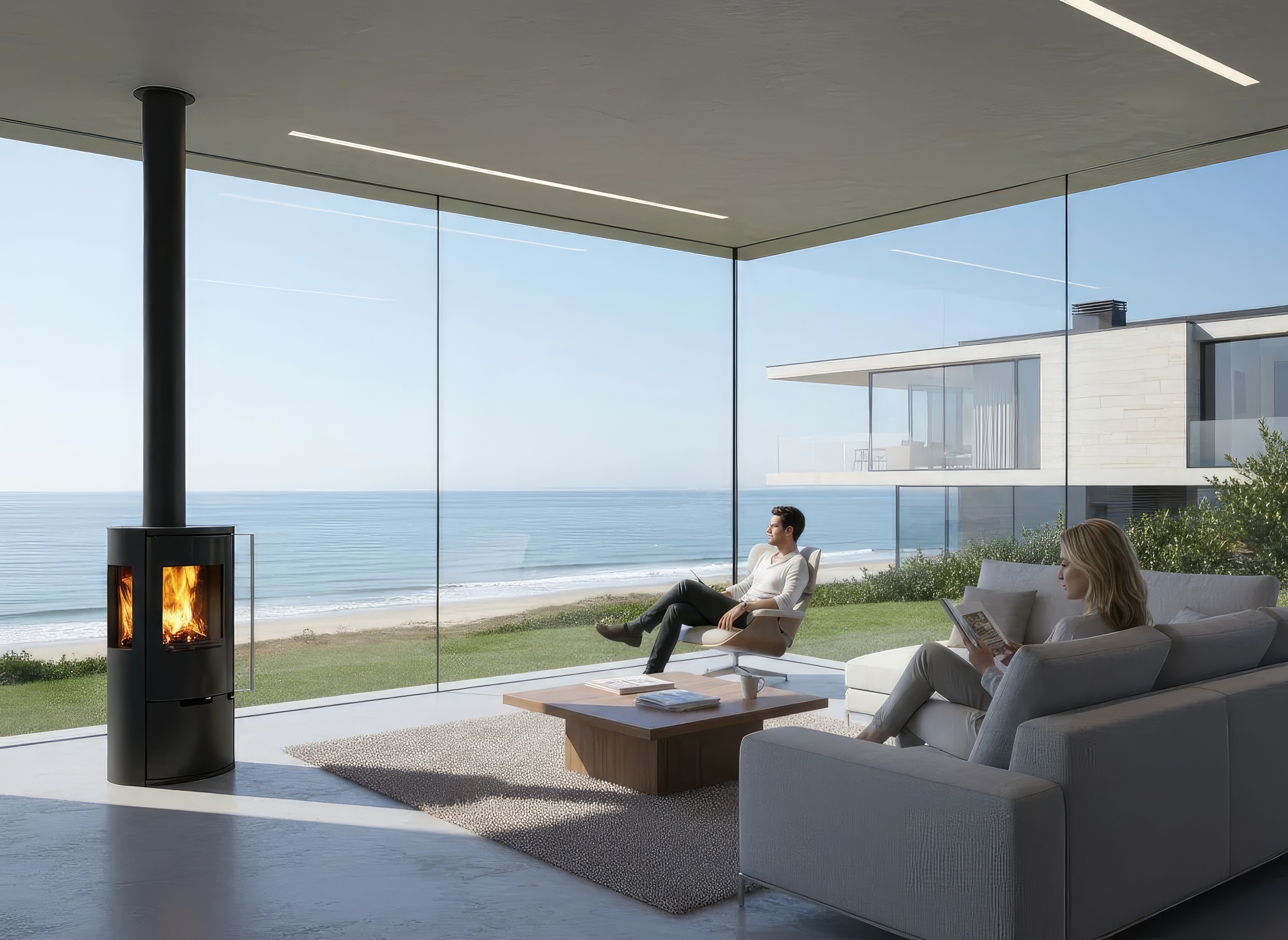 Живое пламя создаёт ощущение уюта, спокойствия и тепла. Благодаря трёхстороннему стеклу огонь виден практически из любой точки комнаты — идеальное решение для гостиной или открытого пространства.