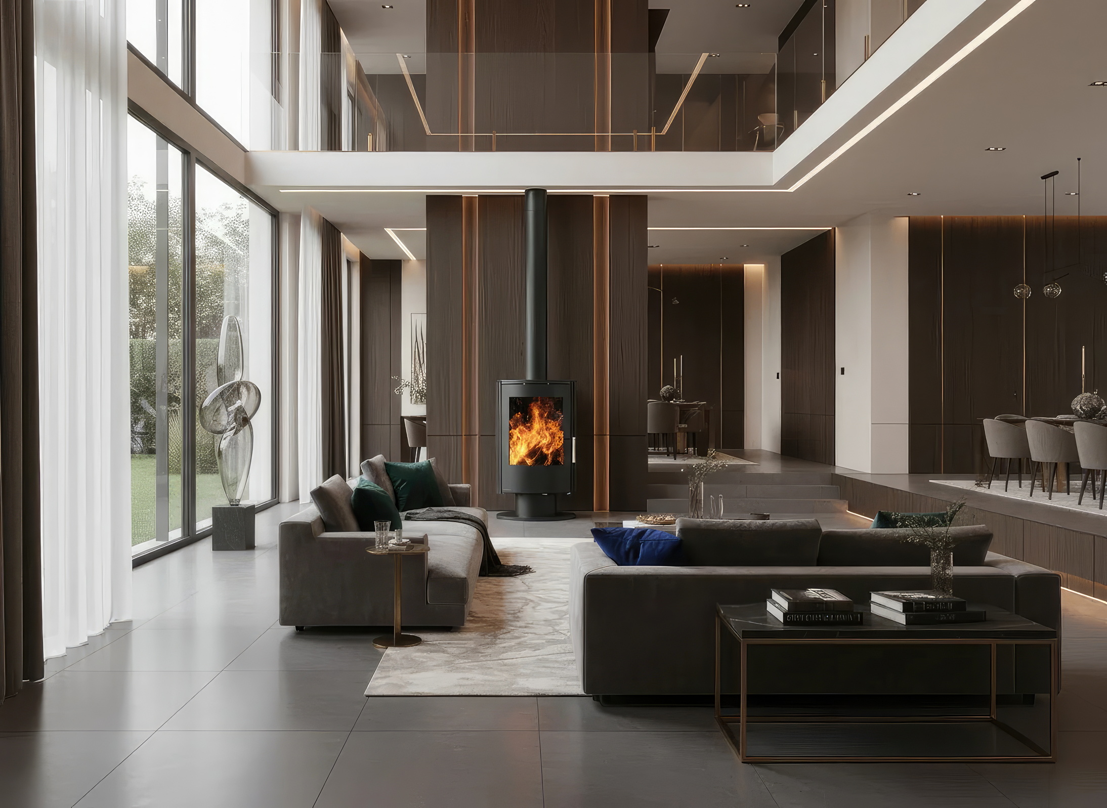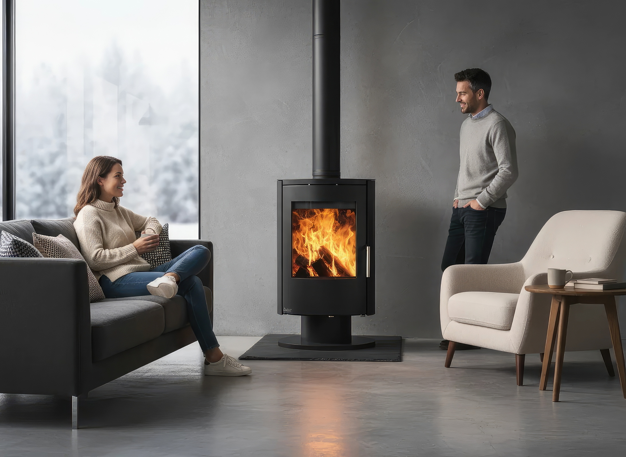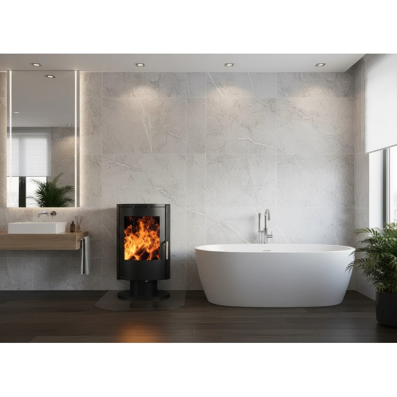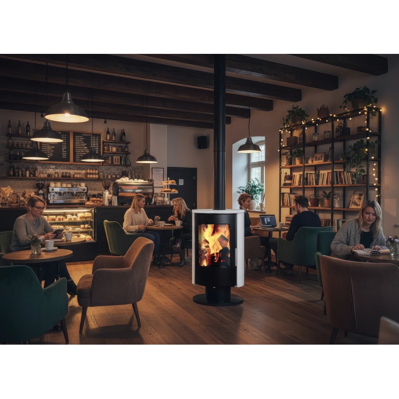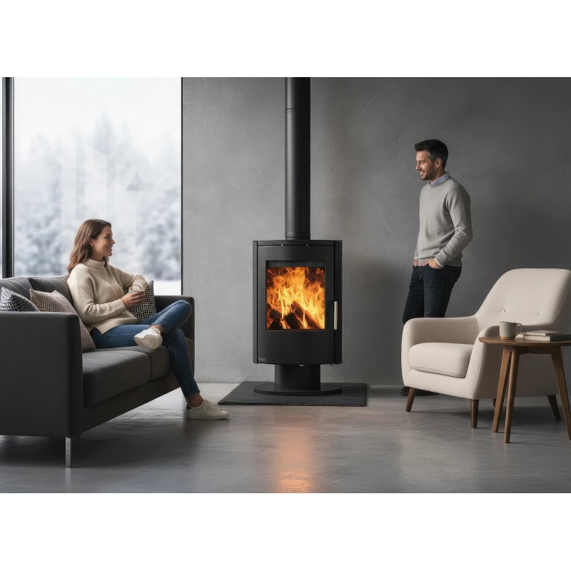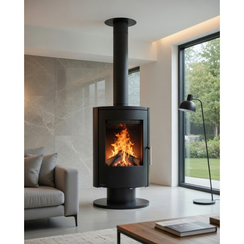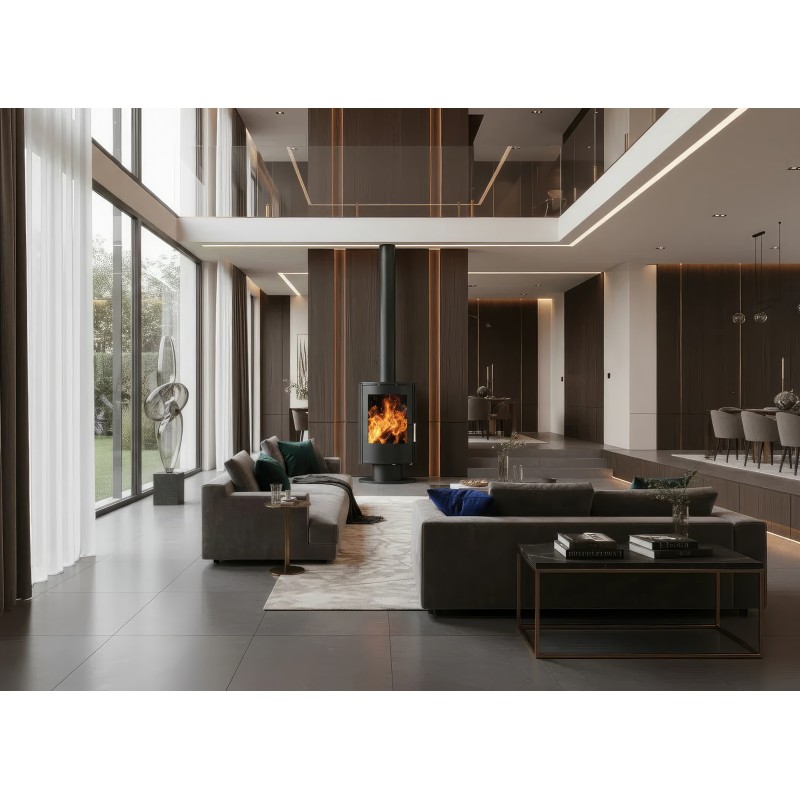 Минималистичный цилиндрический корпус в черном цвете идеально вписывается в интерьеры в стиле Hi-Tech, Loft или Скандинавия. Верхнее подключение дымохода делает монтаж аккуратным и компактным.
