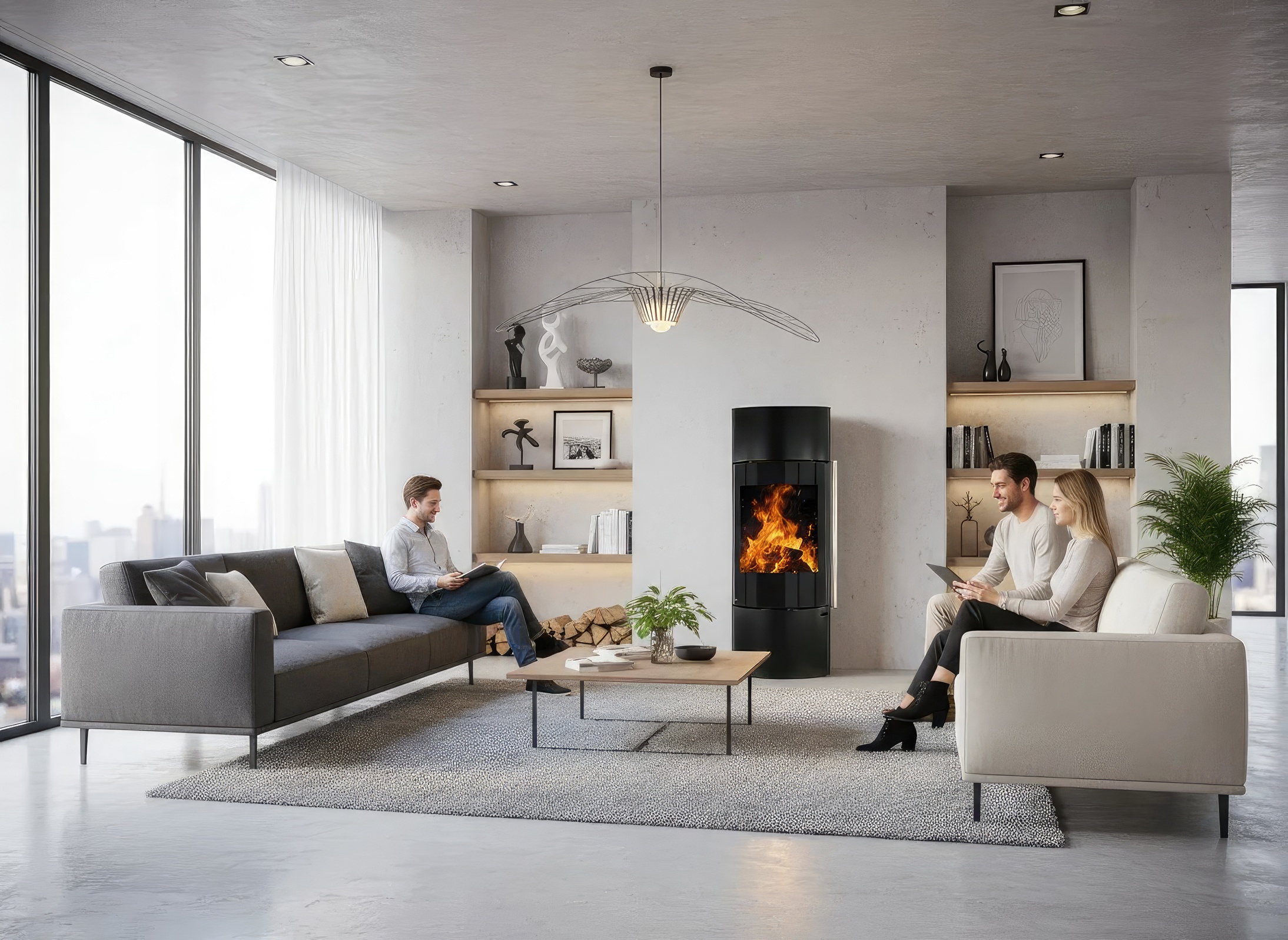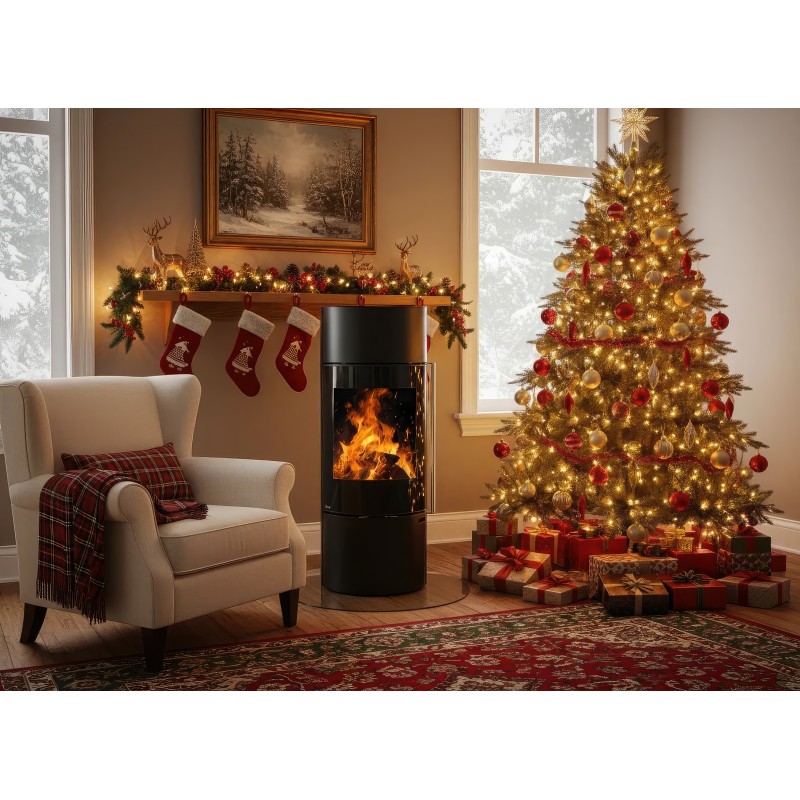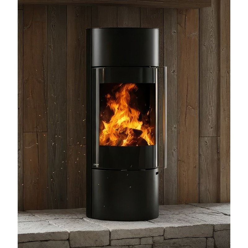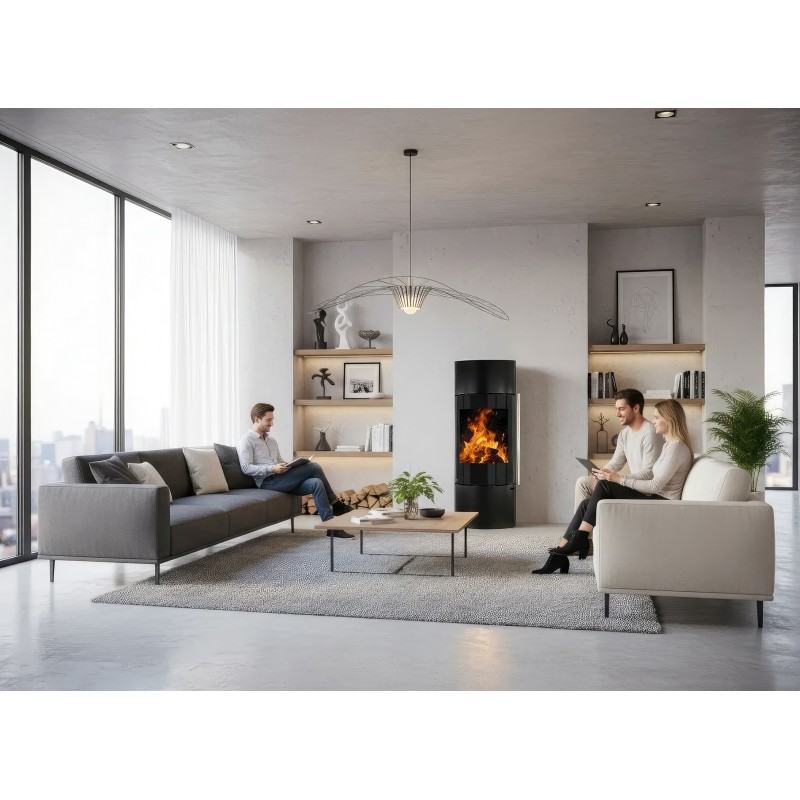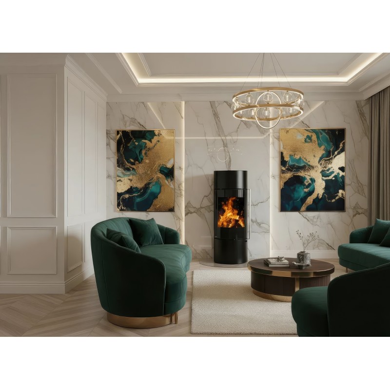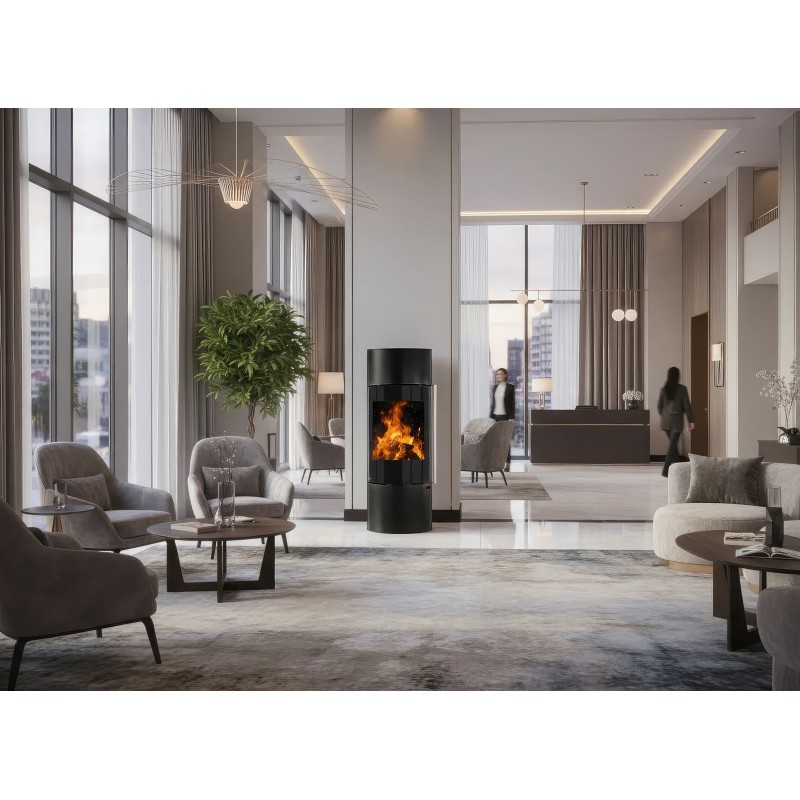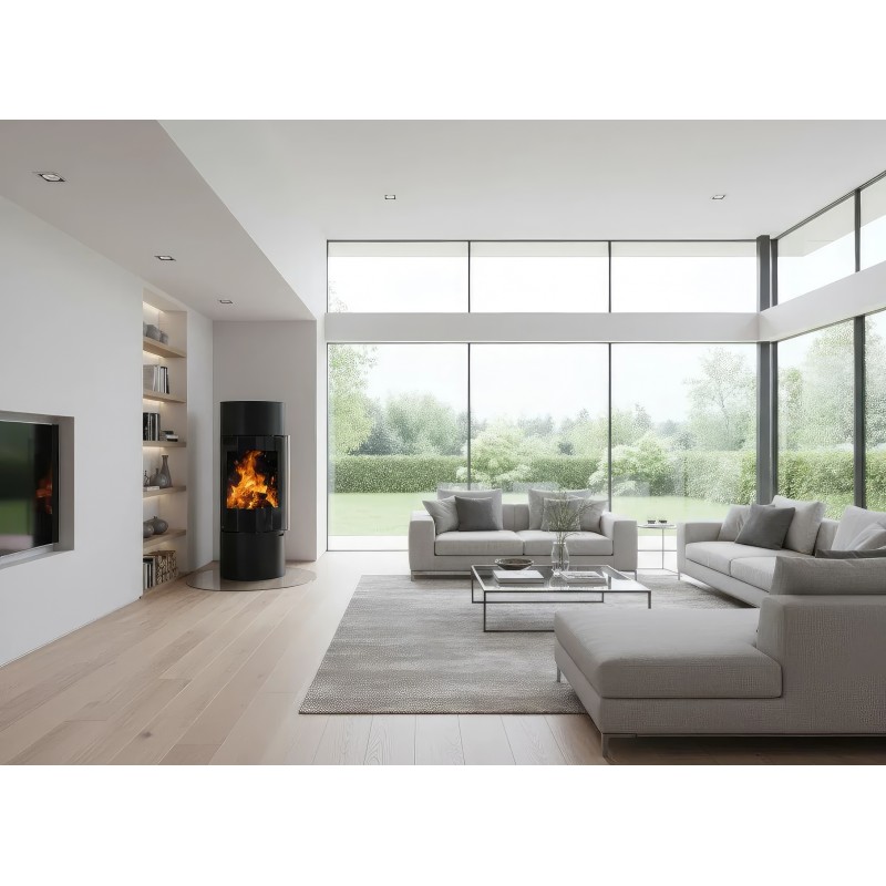 Печь-камин Ember F11 FG — это выбор тех, кто стремится уйти от массивных форм в интерьере. Уникальная конструкция на центральной опорной стойке создает эффект "парящего" камина, визуально расширяя пространство комнаты. Несмотря на свою внешнюю изящность, эта модель является полноценным и мощным отопительным прибором.
