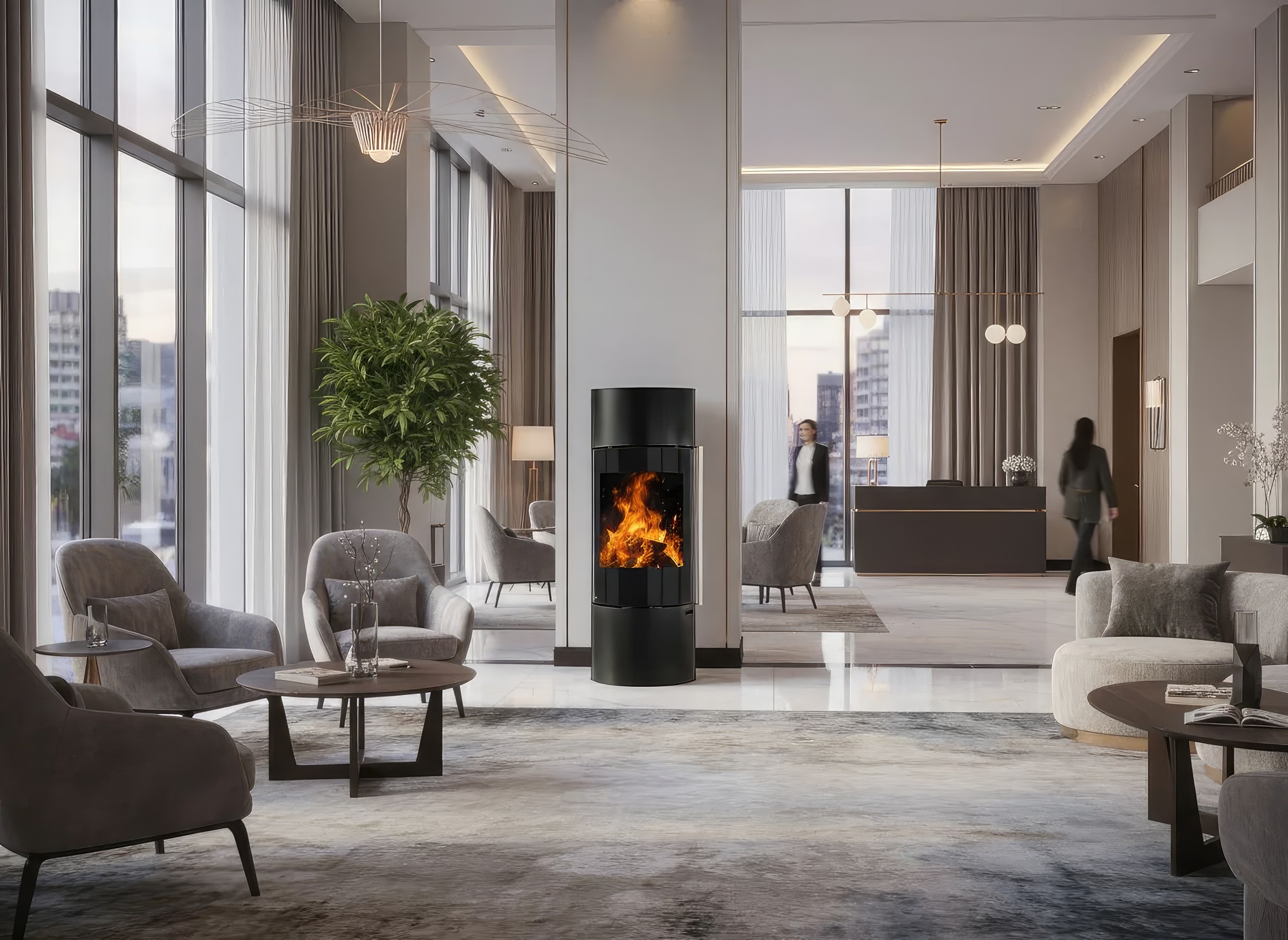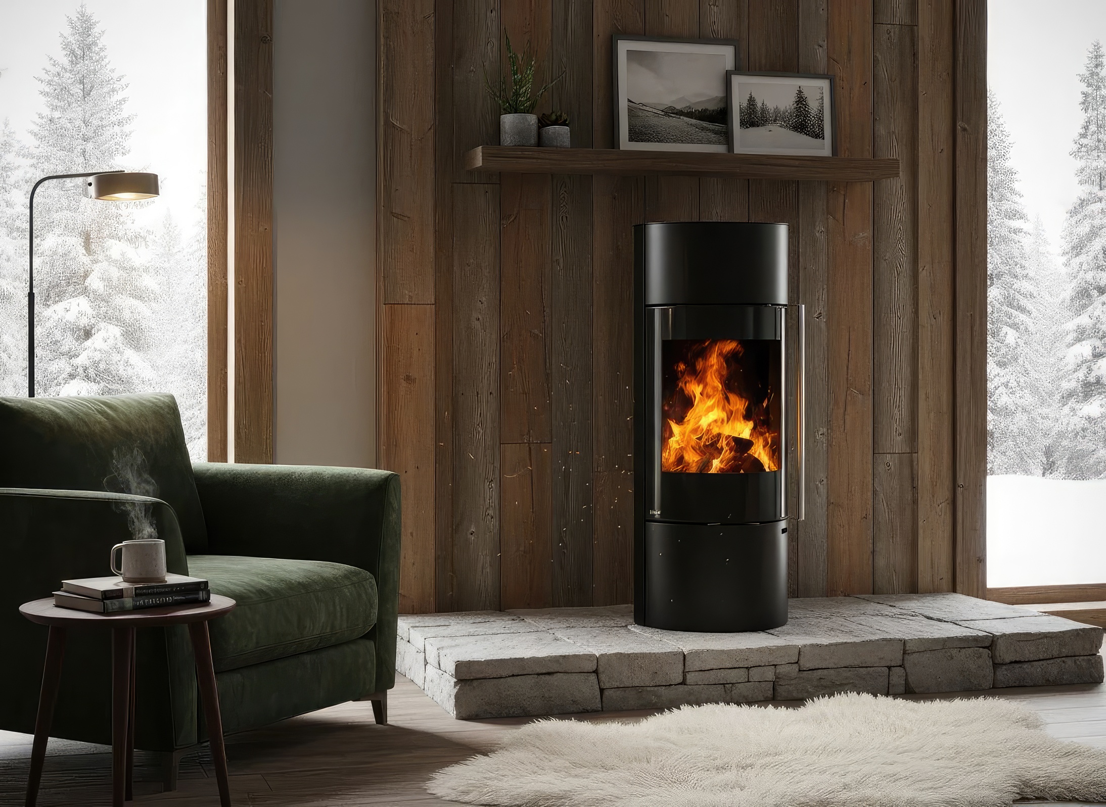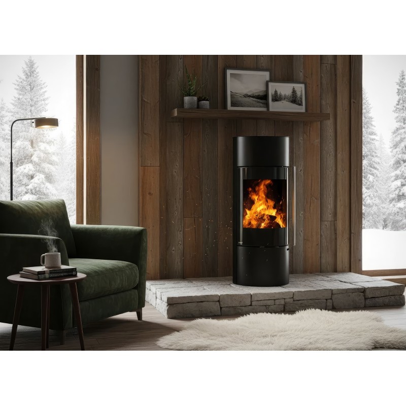 - Дизайн на стойке: Отсутствие массивного основания делает печь идеальной для небольших помещений или минималистичных гостиных, не загромождая пол.