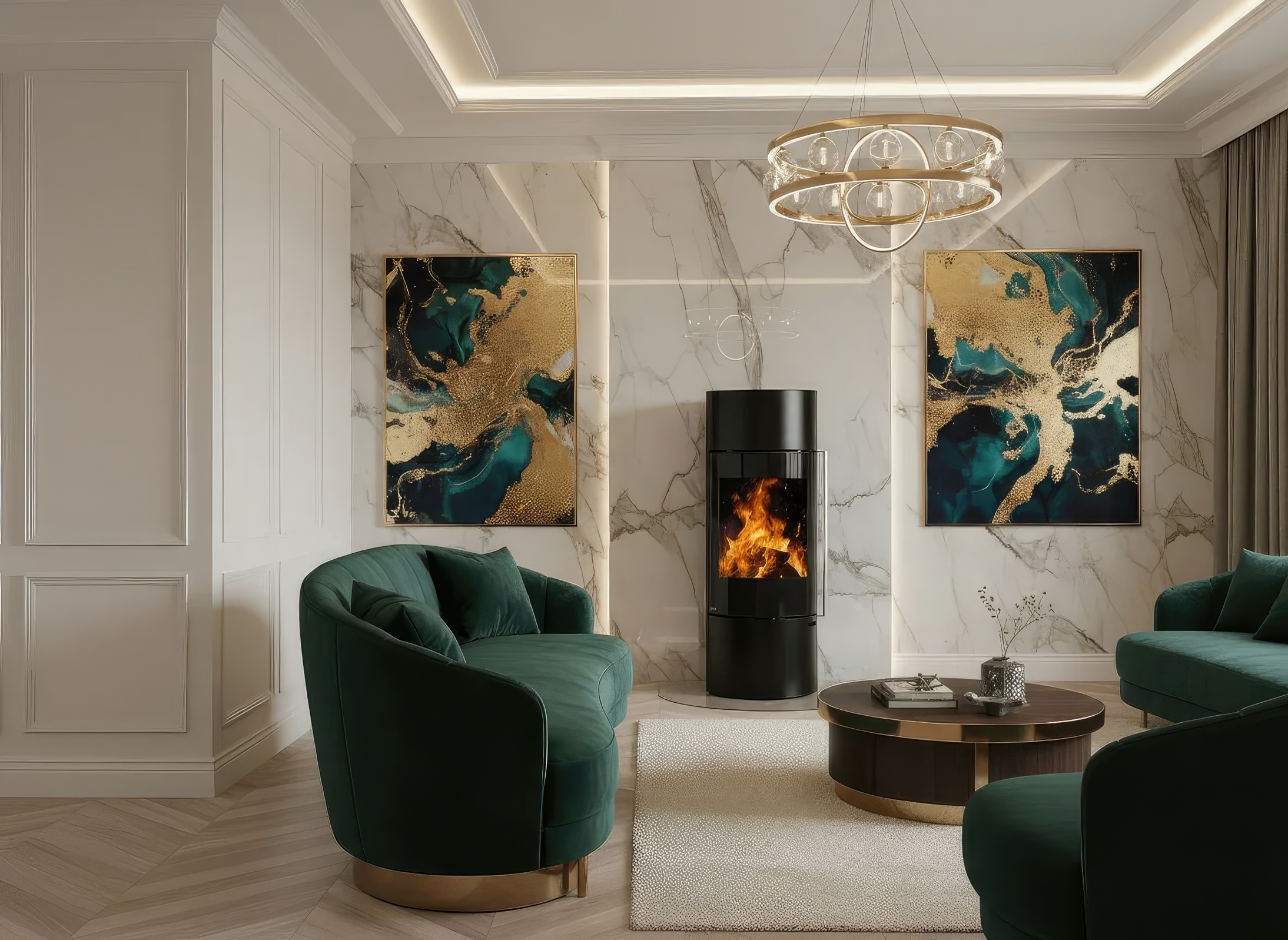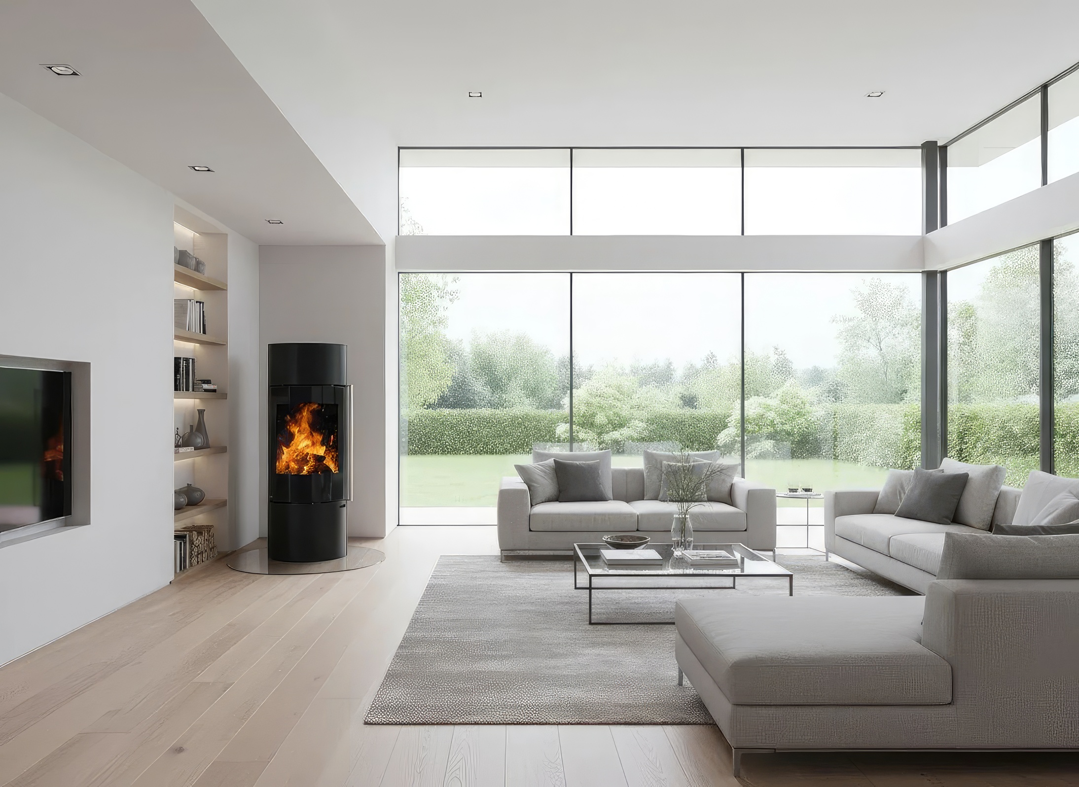 - Фасад Full Glass: Панорамное стекло с черной шелкографией по краям скрывает стальные элементы дверцы, фокусируя всё внимание на живом пламени.