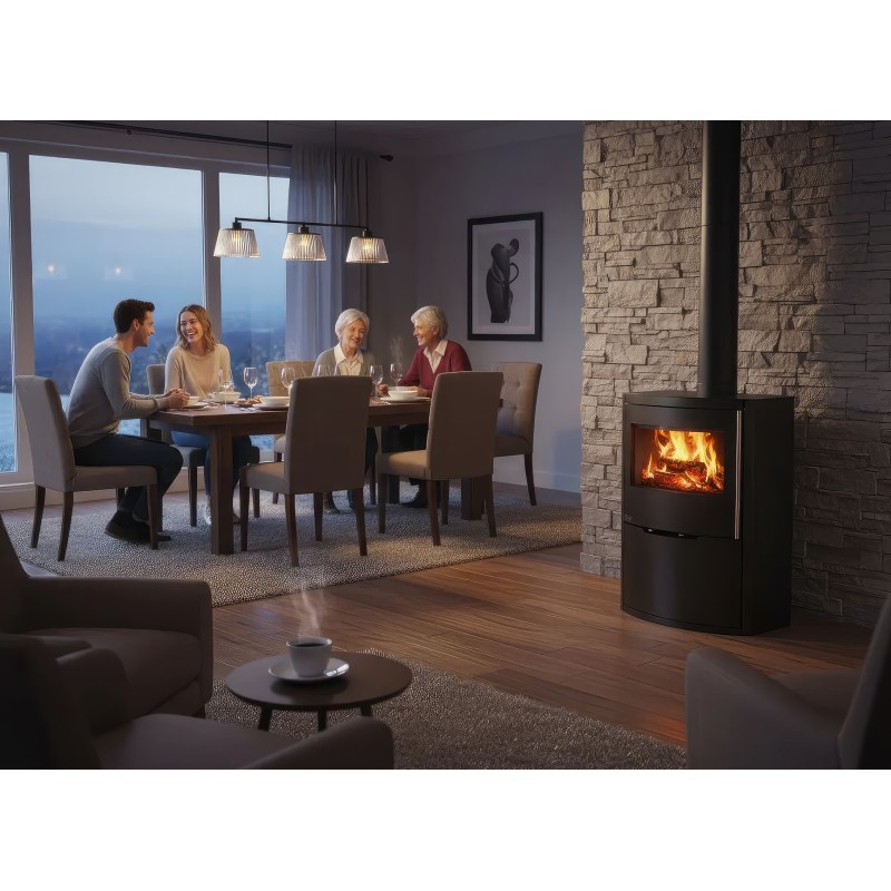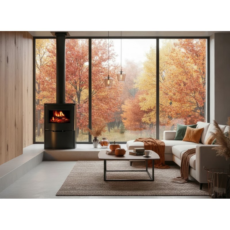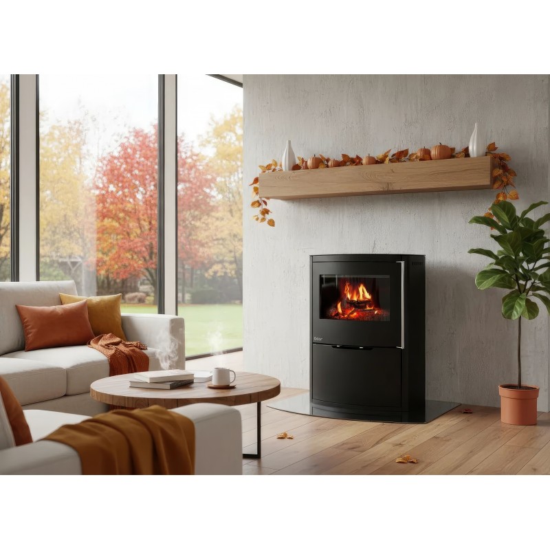 Ember O1 XL оснащена системой внешнего подвода воздуха (CPV), что позволяет подключать забор кислорода напрямую с улицы. Это исключает выжигание воздуха в помещении и обеспечивает стабильную тягу. Внутренняя отделка из светлого вермикулита создает яркий контраст с черным корпусом и способствует полному дожигу газов, повышая экологичность отопления.